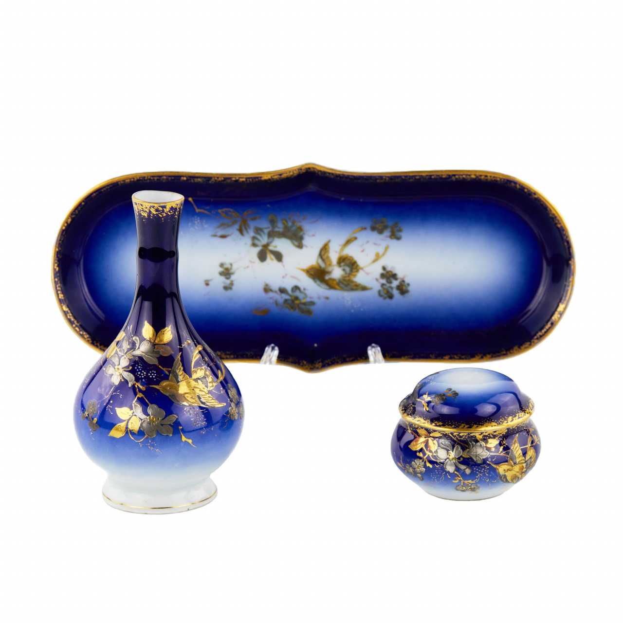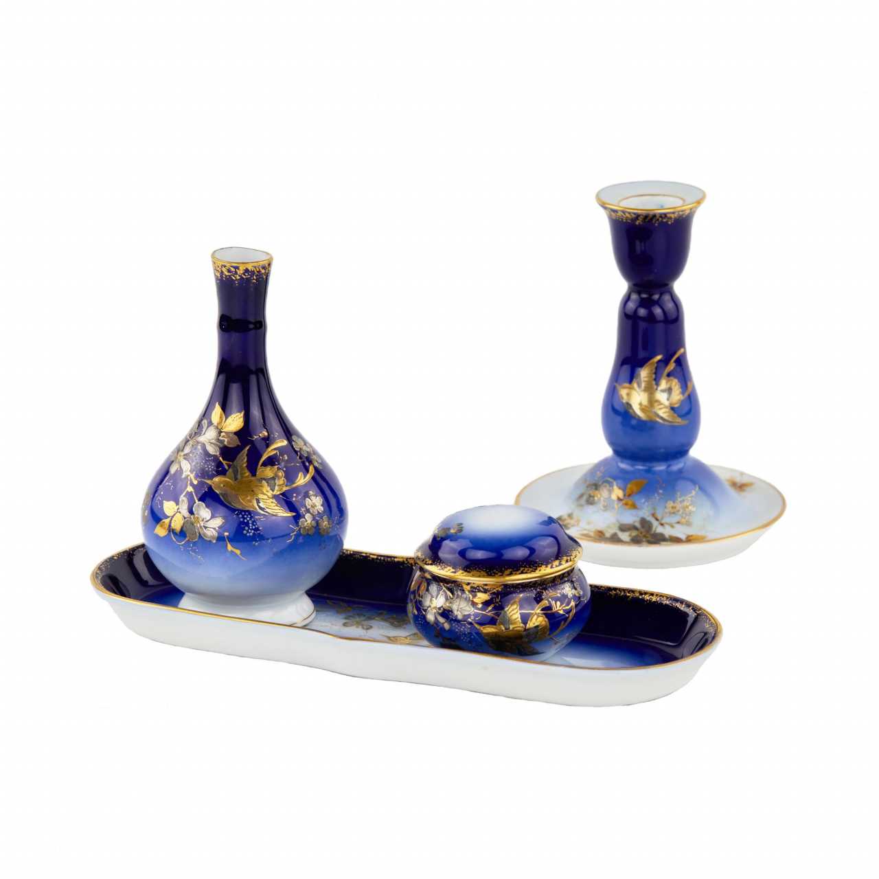 Ensemble de quatre pièces, usine de porcelaine Gardner. Un coin de dames particulier de la fin du 19e siècle, dans le style du debut de la modernite. Comprend : boîte et vase sur plateau et bougeoir autoportant. Allie formes historicistes et decor Art nouveau dynamique. Tous les articles sont marques par l`usine Gardner. Il y a encore un tampon dans la pâte sur le plateau. Hauteur du bougeoir : 14 cm Longueur du plateau : 23 cm.
