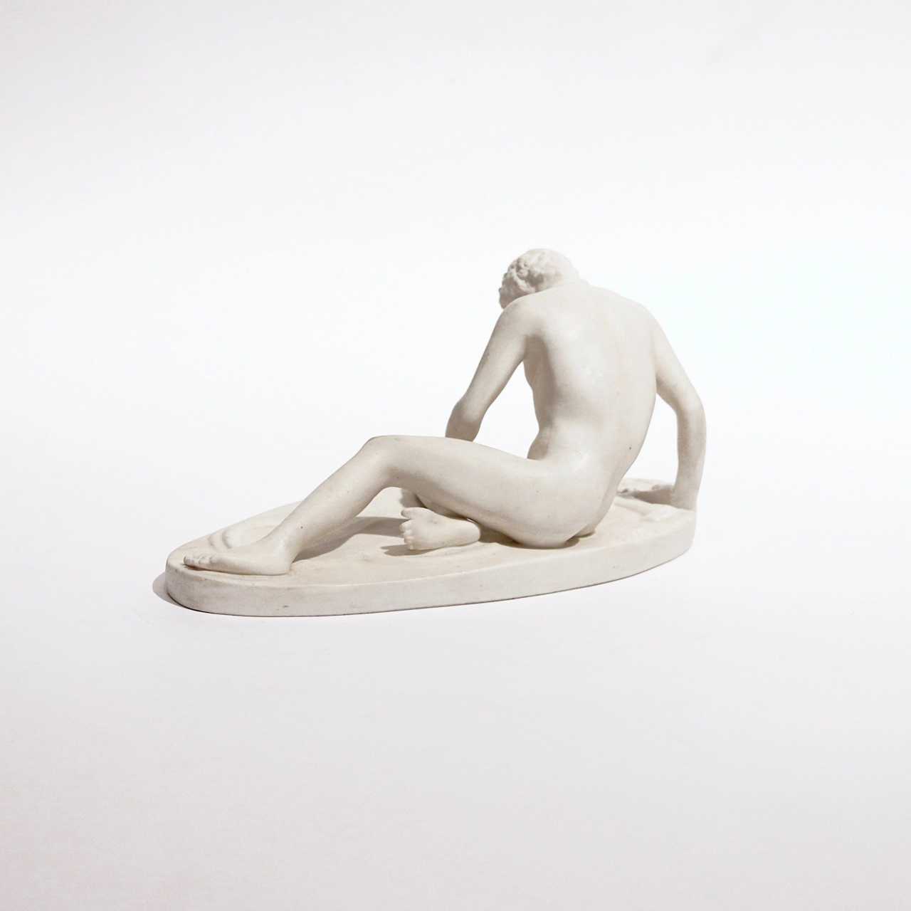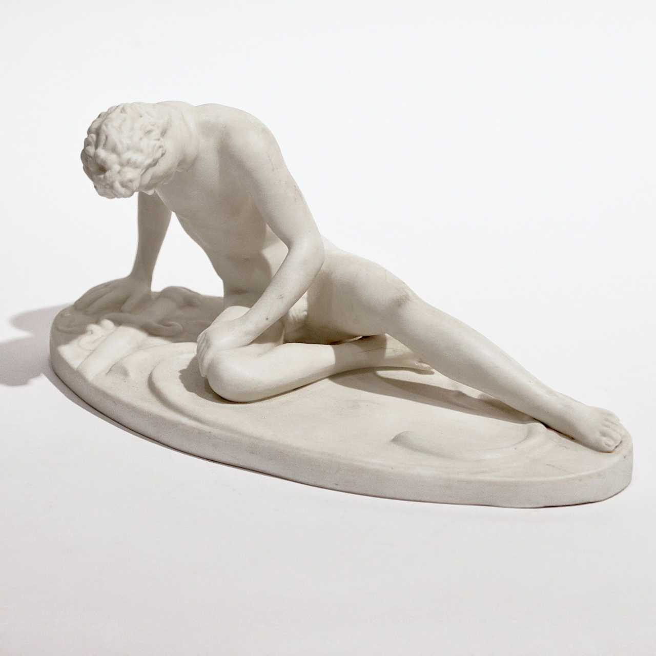 Figurine en biscuit Gallus mourant, realisee à partir de la sculpture du même nom de lepoque hellenistique, la sculpture, en termes de naturalisme et de drame, appartient aux hauteurs de lart ancien. Gallus est represente couche sur un bouclier, nu. Cetait une reponse à la collision du monde Grec avec les vagues de migration des peuples. Attribue au sculpteur de la cour Attale I - Epigon. H-9,5 cm. Allemagne. Debut du XXe siècle.