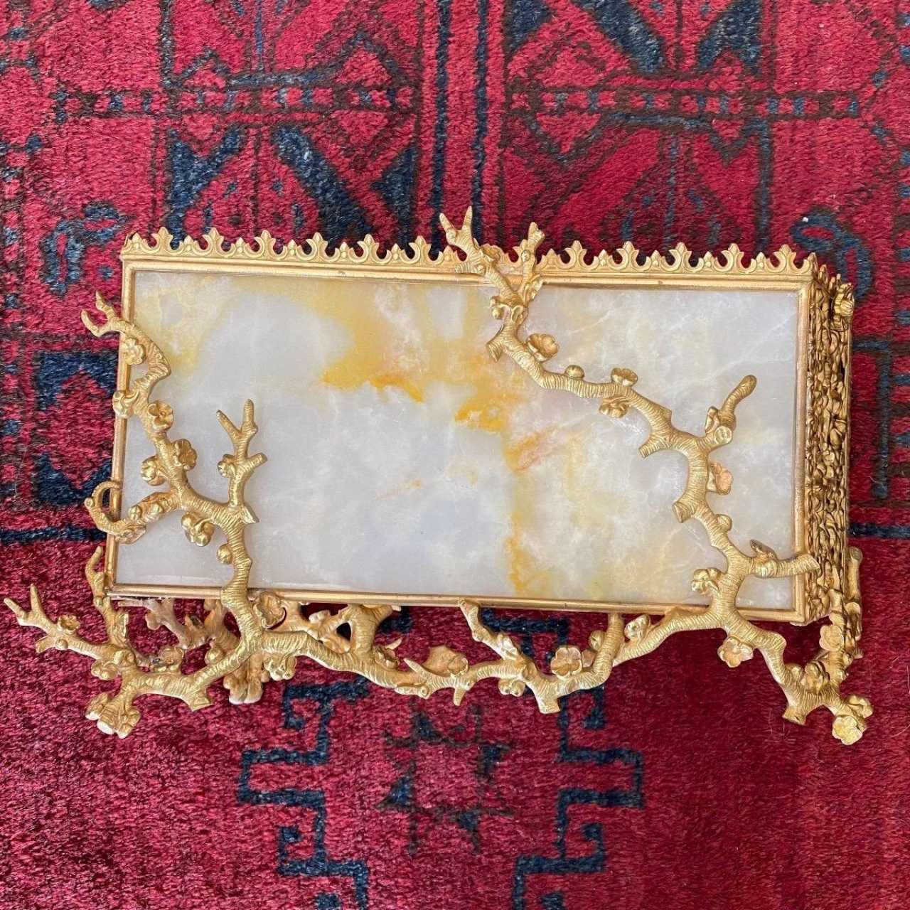 Gilded bronze and alabaster letter carrier in the Japanese style.The bronze tree branch decorations are very delicate. The alabaster plates on the two main sides give a very luminous look to this rare object.The sides are decorated with openwork gilded bronze plates with floral and plant motifs.ideal for an office or hallway.19th century.Perfect condition.