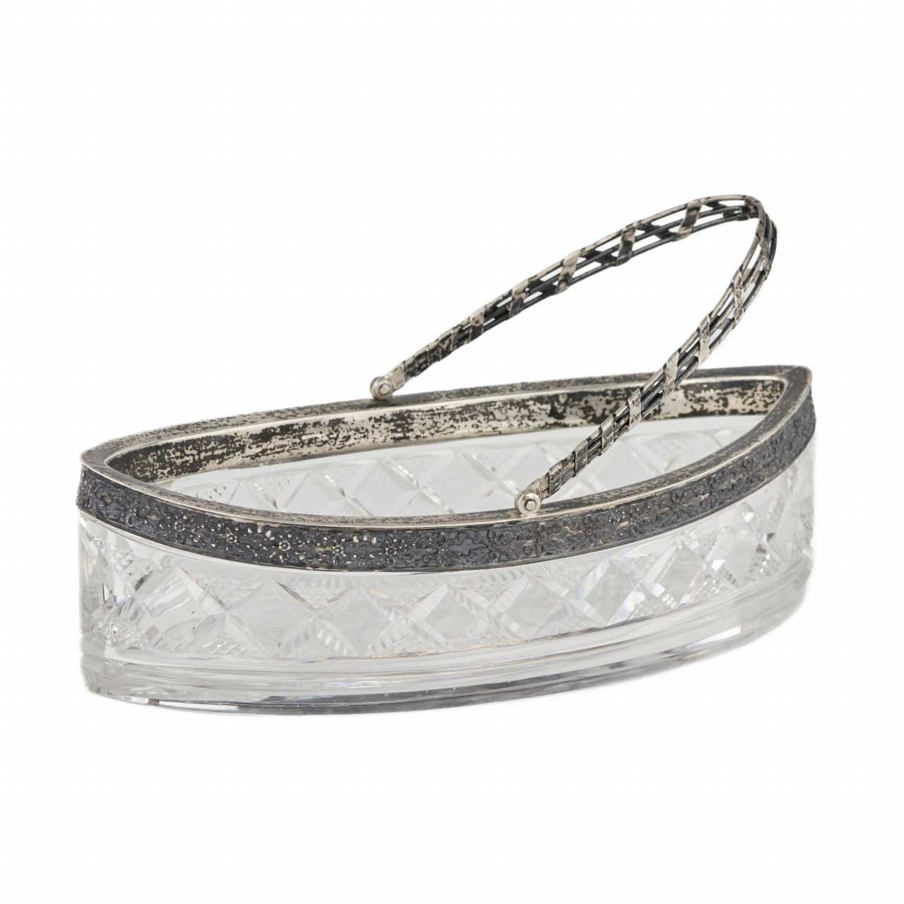 Un grand bol de bonbons en forme de bateau. La bonbonnière en forme de bateau est en cristal avec un lisere argente et une anse pivotante. La bordure en cristal le long du bord superieur du bol à bonbons est faite dune bande argentee avec un motif de fleurs en ruban en relief. La poignee est coulee, en osier dans un style moderne. Argent, fonte, poinçon, dessin (manche) Cristal, taille. Excellente securite. Patine naturelle sur largent Poinçons : 1) Pointeur de dosage en argent 84 dans un ecu carre ; 2) la marque du 15e artel de bijoutiers de Moscou - 15A dans un bouclier carre 3) la marque du departement danalyse du district de Moscou - une tête feminine dans un kokoshnik oriente vers la droite (dans un bouclier rond) Empire russe, Moscou, 15 Artel de bijoutiers de Moscou, 1908 - 1917. Dimensions : longueur - 27,6 cm, largeur - 14,0 cm, hauteur (hors anse) - 8,3 cm.
