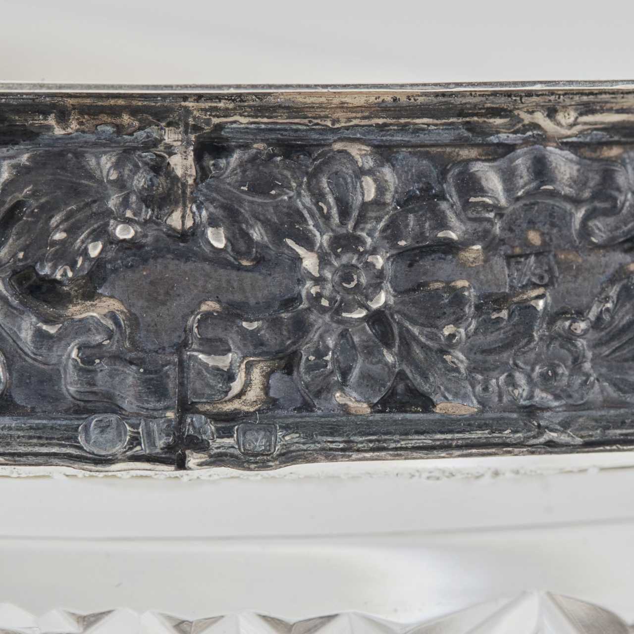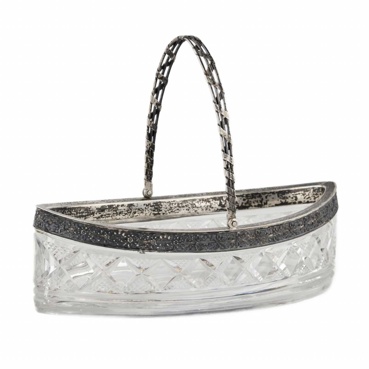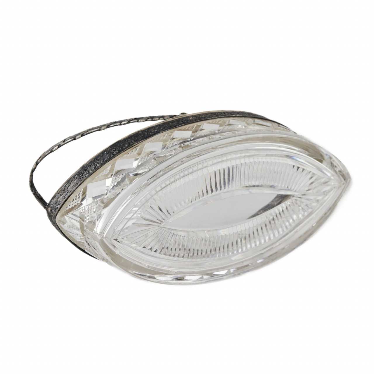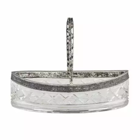 Un grand bol de bonbons en forme de bateau. La bonbonnière en forme de bateau est en cristal avec un lisere argente et une anse pivotante. La bordure en cristal le long du bord superieur du bol à bonbons est faite dune bande argentee avec un motif de fleurs en ruban en relief. La poignee est coulee, en osier dans un style moderne. Argent, fonte, poinçon, dessin (manche) Cristal, taille. Excellente securite. Patine naturelle sur largent Poinçons : 1) Pointeur de dosage en argent 84 dans un ecu carre ; 2) la marque du 15e artel de bijoutiers de Moscou - 15A dans un bouclier carre 3) la marque du departement danalyse du district de Moscou - une tête feminine dans un kokoshnik oriente vers la droite (dans un bouclier rond) Empire russe, Moscou, 15 Artel de bijoutiers de Moscou, 1908 - 1917. Dimensions : longueur - 27,6 cm, largeur - 14,0 cm, hauteur (hors anse) - 8,3 cm.