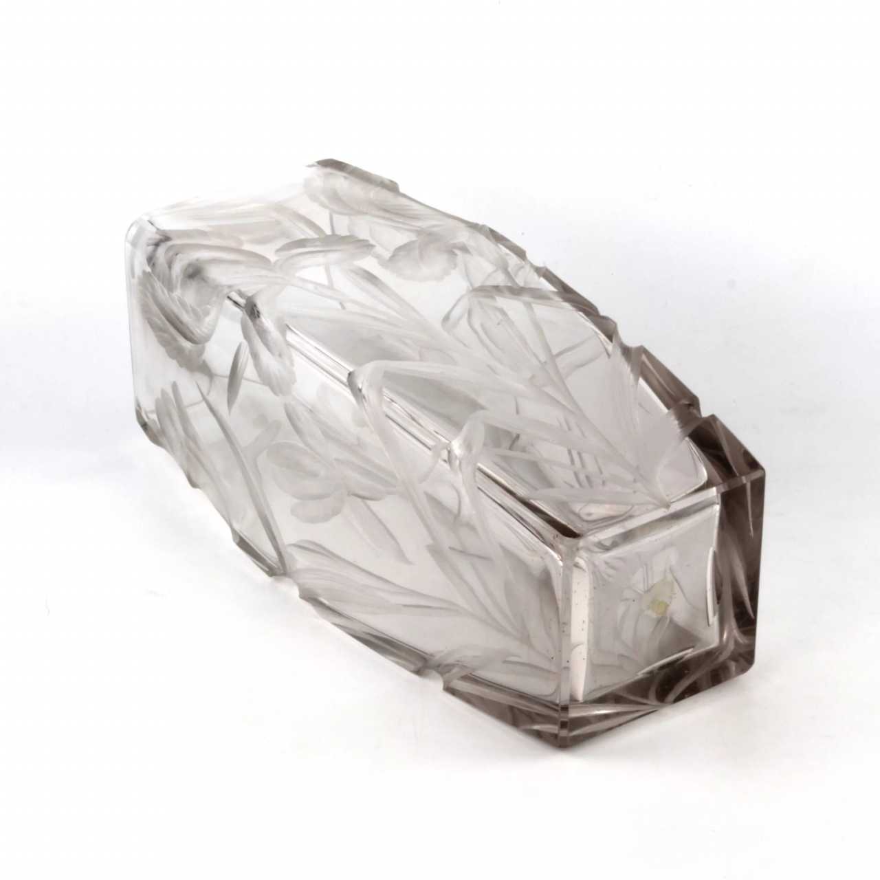 Grand vase en cristal lourd avec des iris luxueux, epoque Art Nouveau tardive. Il combine parfaitement la clarte et le laconicisme de la geometrie, avec la texture pittoresque des fleurs gravees. H-38cm.