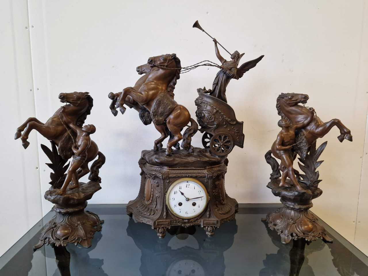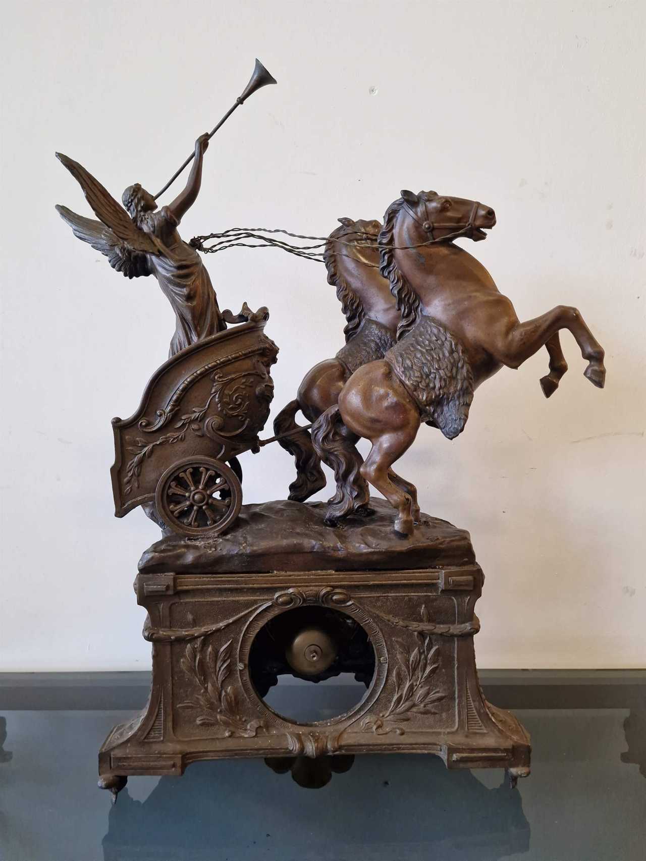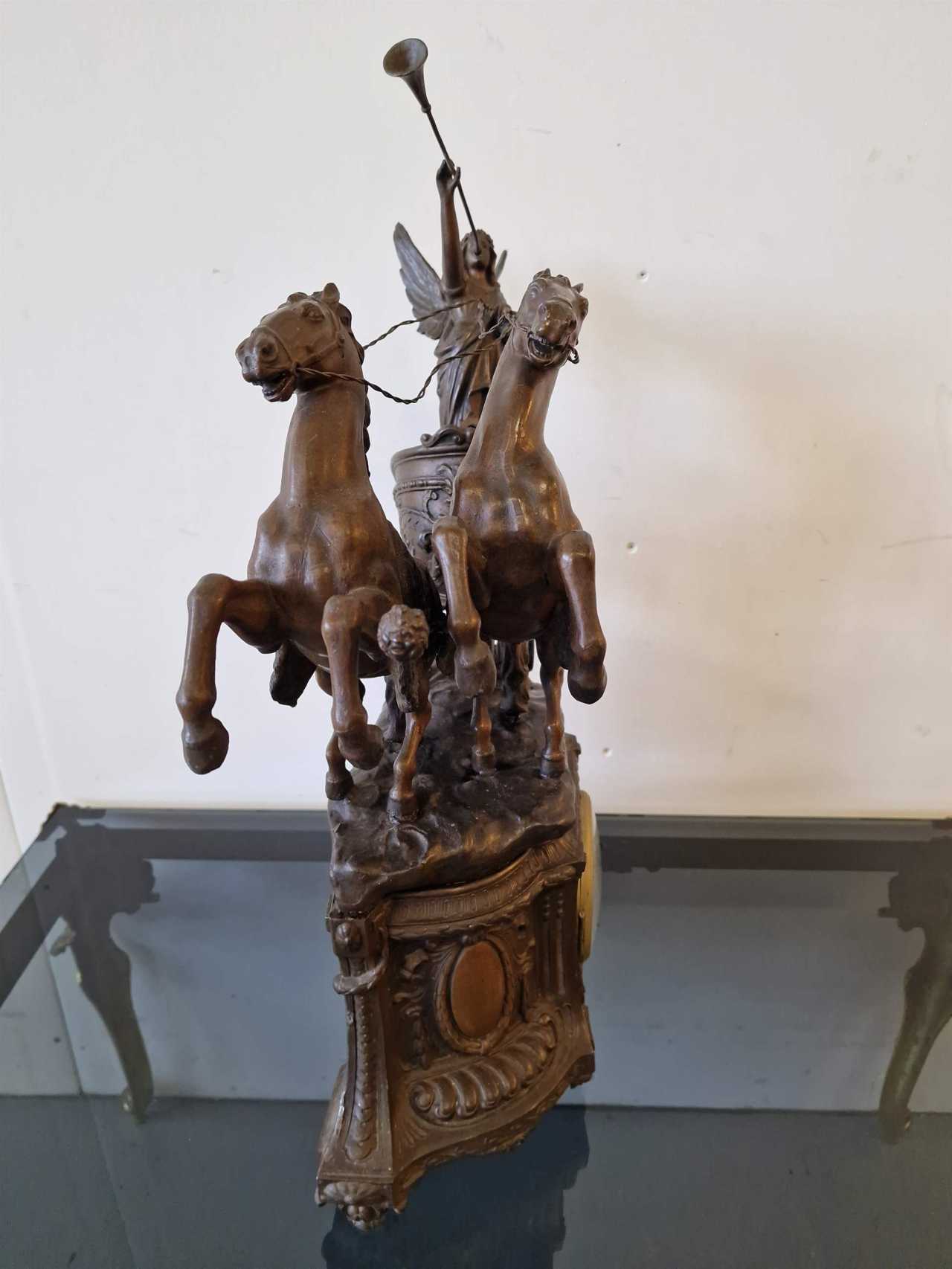 Horloge avec figures de chevaux.Métal.France.Années 1920.Dimensions du cadran : hauteur 60 cm ; longueur 37 cm ; largeur 18 cm.