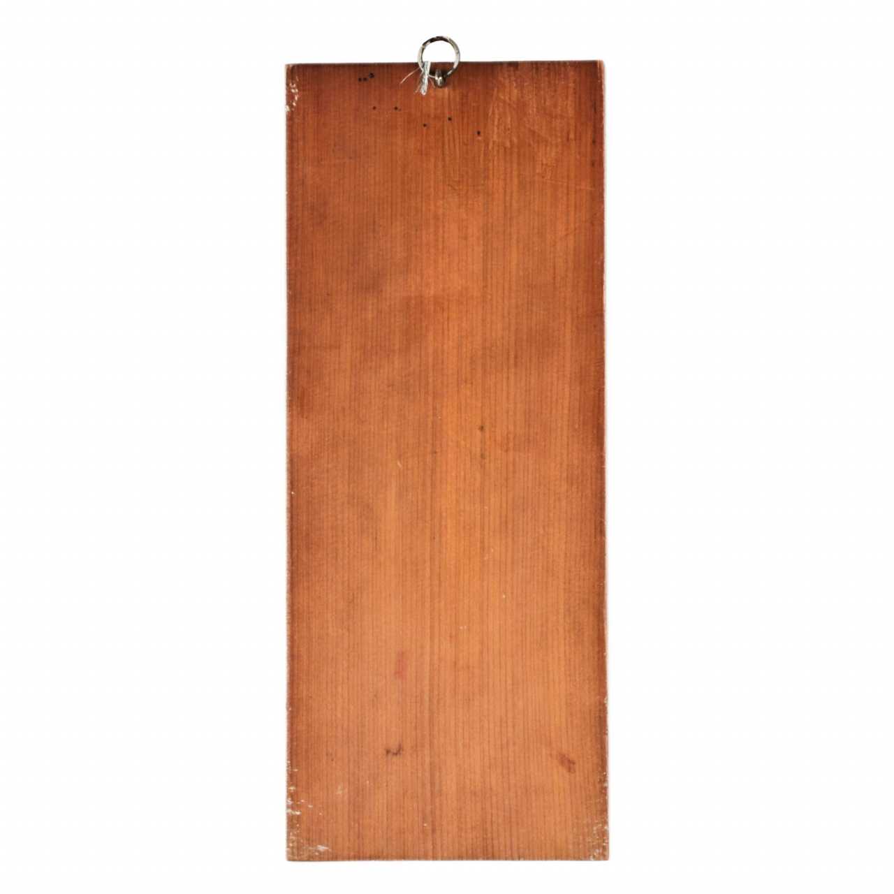 Licône de la chambre, un autel de poche de sainte Alexandra, sur une planche de parquet, porte une image benissante de la sainte en pied sur un fond dore. Vêtue dhabits royaux, recouverte dun manteau ecarlate, elle sombrage dune croix et dun cœur, auxquels elle presse la main. Lanticipation festive, rayonnante et humble est animee par le motif Art nouveau dynamique dans les coins superieurs de licône. Cest une symbiose symbolique dune fleur, dun soleil, de chapiteaux dans larchitecture dun monde meilleur.
