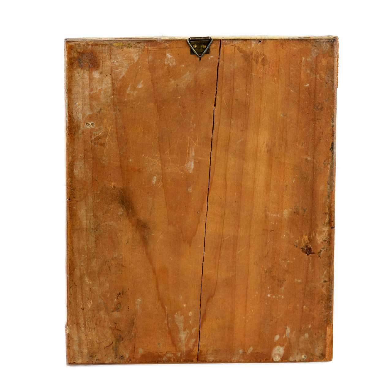 Icône russe de la sainte martyre Antonina, tournant des XIXe et XXe siècles. Une petite image personnelle est peinte en or vif et festif, dans les canons de la peinture realiste au tournant des XIXe et XXe siècles. La demi-figure du saint est animee par un tour de trois quarts, une construction volumetrique-plastique de la figure, une concentration calme et confiante, des mains ecrites de manière realiste avec une croix. L`ornementation soignee et fractionnee du champ dore et son organisation ne contredisent pas la datation annoncee. Dimensions : 17x14 cm.