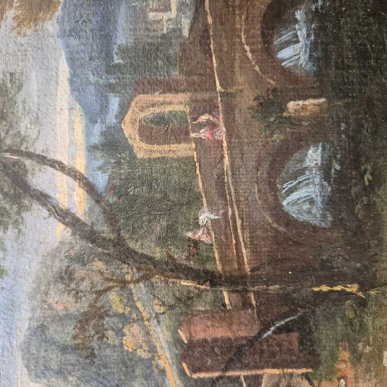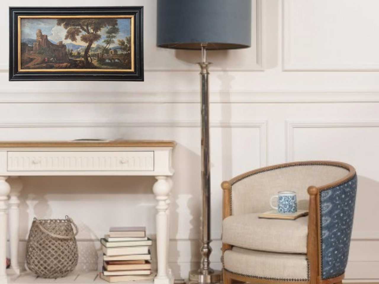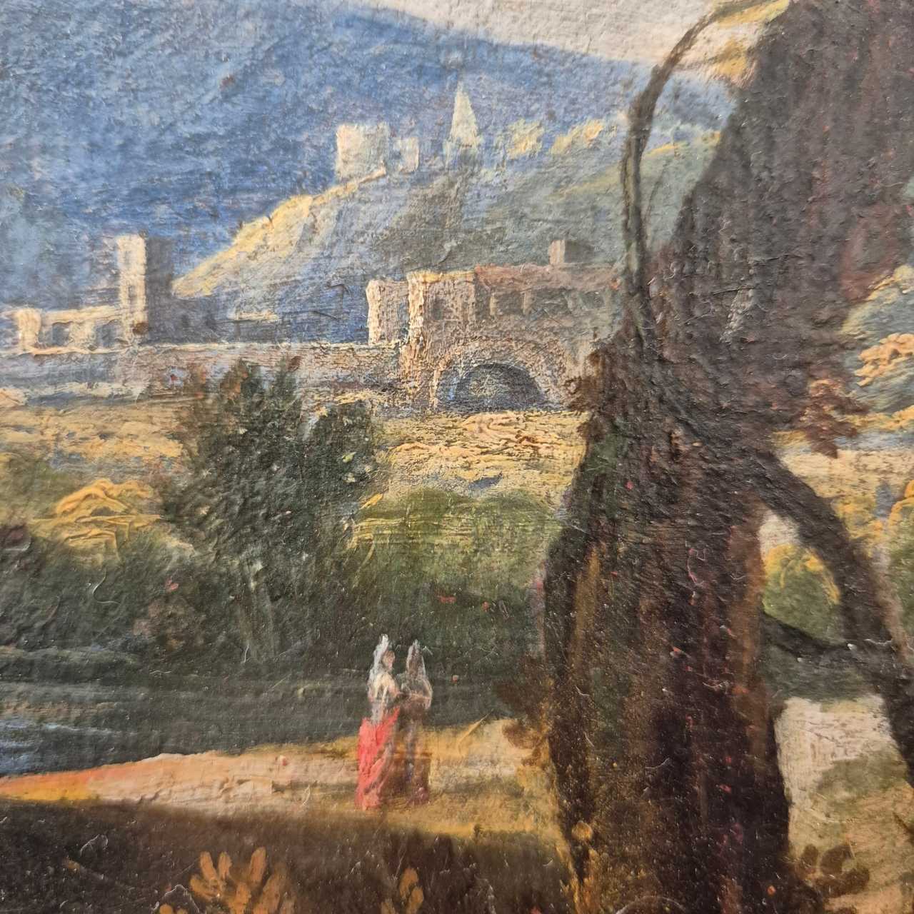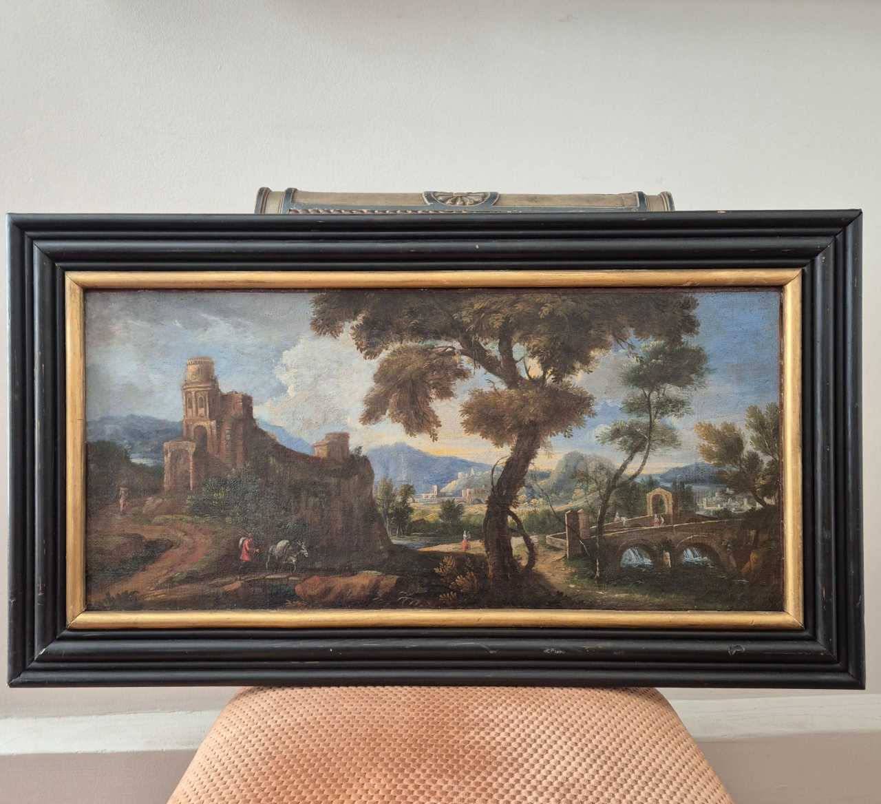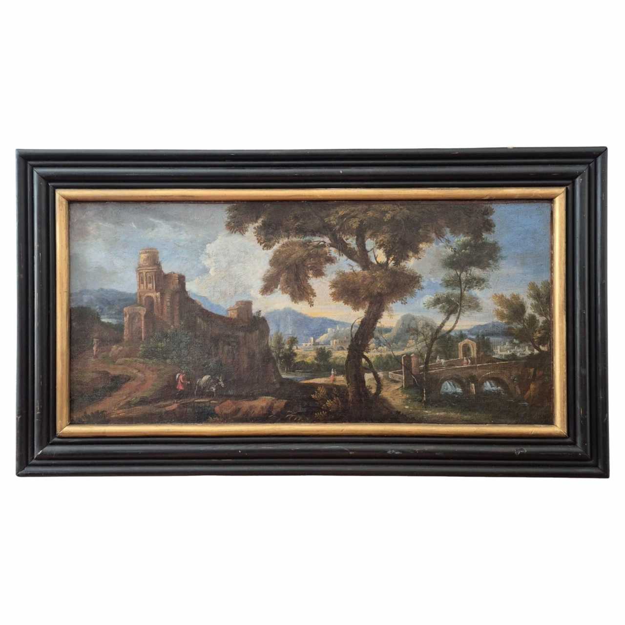 An 19th-century oil on canvas depicting an Italian landscape characterized by a broad view of hills and mountains in the distance and a river whose winding course stretches to the front of the painting. This background is dotted with small hamlets and villages, whose architecture can only be guessed at.In the foreground, the picture has been deliberately separated at its center by a very large tree, which divides the composition in two: on the left are the ancient ruins of an ancient temple and small human figures (two porters and a traveler on a donkey), while on the right are two high-ranking women in deep conversation and a servant who appears to be washing sheets on a stone bridge, under whose arches we can make out waterfalls.This small-format painting is full of details and references that will be interesting to decipher. It will be easy to place in an office or a large library.Dimensions unframedWidth 61 cmheight 28 cm