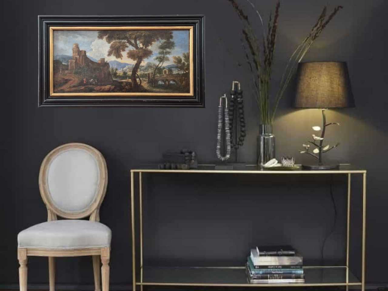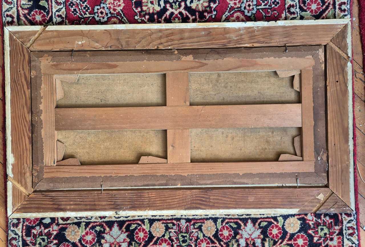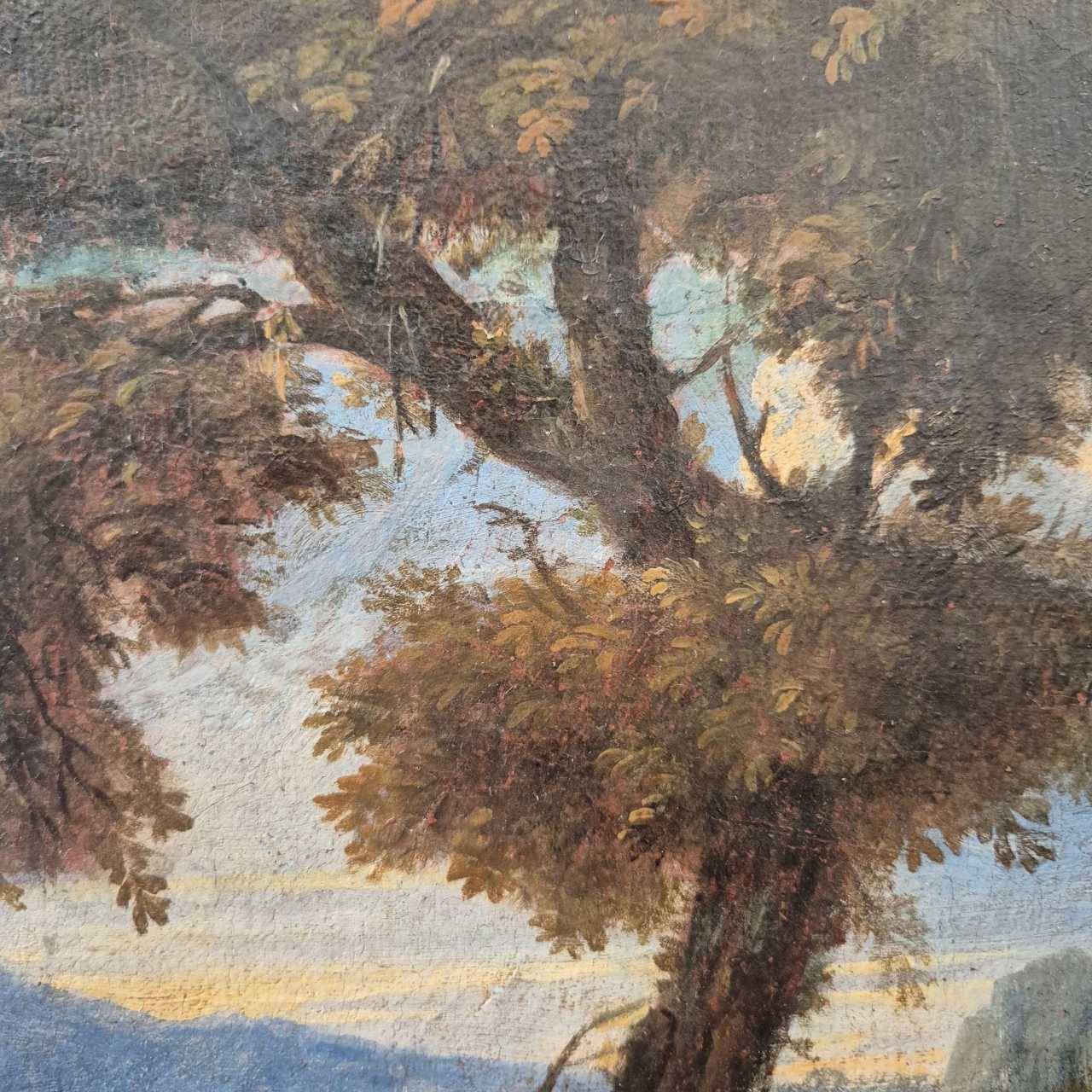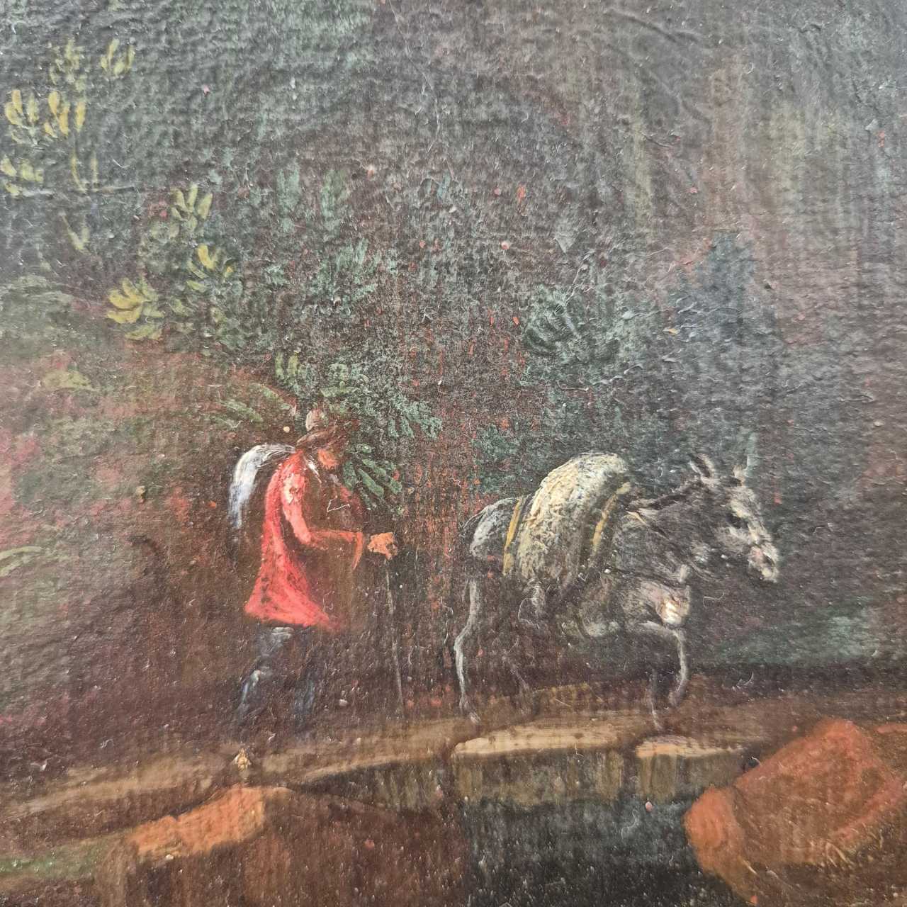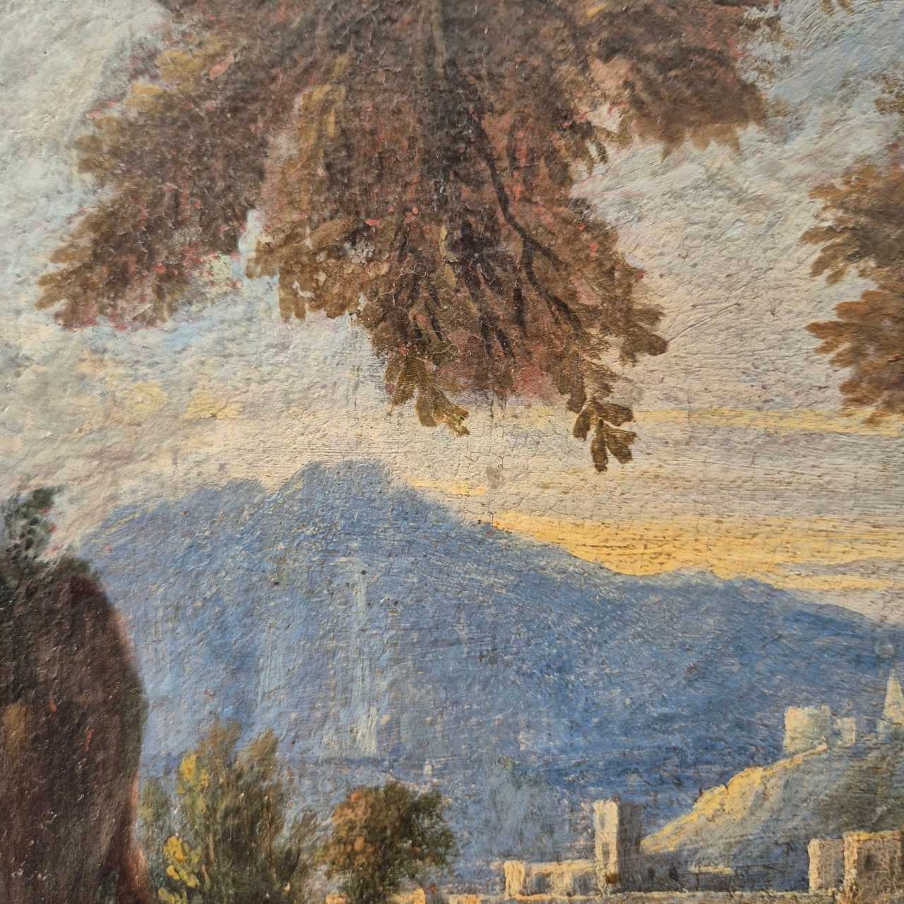 An 19th-century oil on canvas depicting an Italian landscape characterized by a broad view of hills and mountains in the distance and a river whose winding course stretches to the front of the painting. This background is dotted with small hamlets and villages, whose architecture can only be guessed at.In the foreground, the picture has been deliberately separated at its center by a very large tree, which divides the composition in two: on the left are the ancient ruins of an ancient temple and small human figures (two porters and a traveler on a donkey), while on the right are two high-ranking women in deep conversation and a servant who appears to be washing sheets on a stone bridge, under whose arches we can make out waterfalls.This small-format painting is full of details and references that will be interesting to decipher. It will be easy to place in an office or a large library.Dimensions unframedWidth 61 cmheight 28 cm