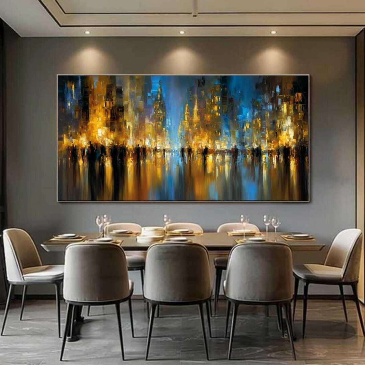 Эксклюзивная абстрактная картина маслом: «Ночной город» — это уникальное произведение, наполненное глубиной и загадочной атмосферой городской ночи. На холсте изображён образ ночного города, отражающегося в спокойной воде, выполненный в абстрактной манере. Вкрапления золотой потали придают картине особую роскошь, создавая мерцающий эффект света, который словно оживляет сцену, наполняя интерьер теплом и изысканностью.