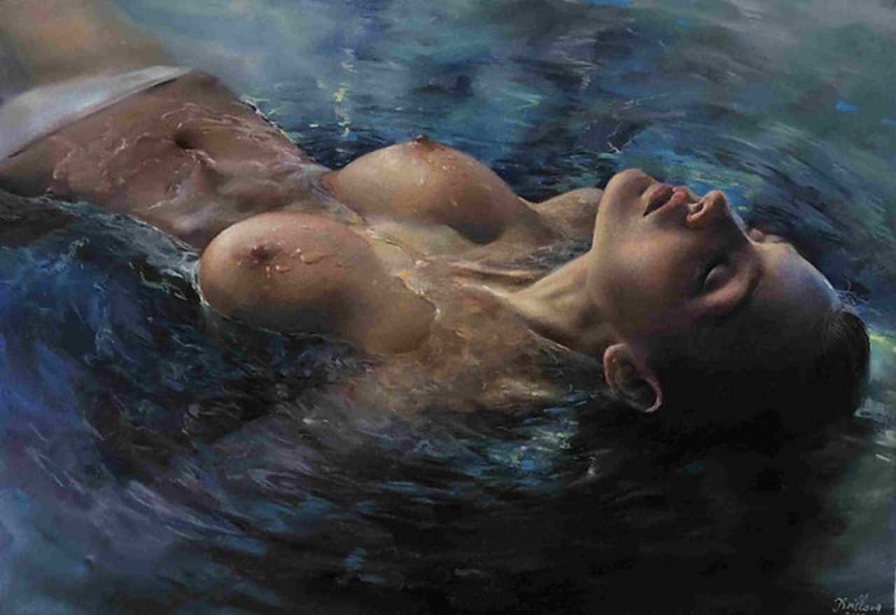 Présentation de notre tableau qui capture le moment paisible et calme d&39;une jeune fille nageant dans un lac d&39;un bleu profond. La jeune fille s&39;allonge sur le dos, les yeux fermés, en toute détente alors qu&39;elle flotte sans effort à la surface de l&39;eau. L’artiste a habilement capturé la beauté calme du moment, avec les douces ondulations de l’eau et les reflets étincelants du soleil créant une sensation de calme et d’immobilité. Le corps de la fille est partiellement immergé dans l&39;eau, avec des gouttelettes d&39;eau scintillant sur sa peau, ajoutant à la sensation de mouvement et de fluidité de la pièce. La poitrine de la fille est nue, ce qui donne un sentiment de vulnérabilité et d&39;innocence à la scène. L&39;artiste a créé un contraste saisissant entre la beauté naturelle du corps des filles et le magnifique environnement naturel du lac, les tons bleu profond de l&39;eau créant une atmosphère riche et immersive. Rendu dans un style réaliste, le tableau montre l’utilisation habile de la couleur et l’attention portée aux détails par l’artiste. C&39;est une belle représentation de la sérénité et de la beauté de la nature et de la forme humaine. Cette peinture fera certainement un merveilleux ajout à toute collection d’art ou comme point central dans un salon. Format A3, les dimensions sont de 42 x 29,7 cm. Pastel sur papier d&39;art.
