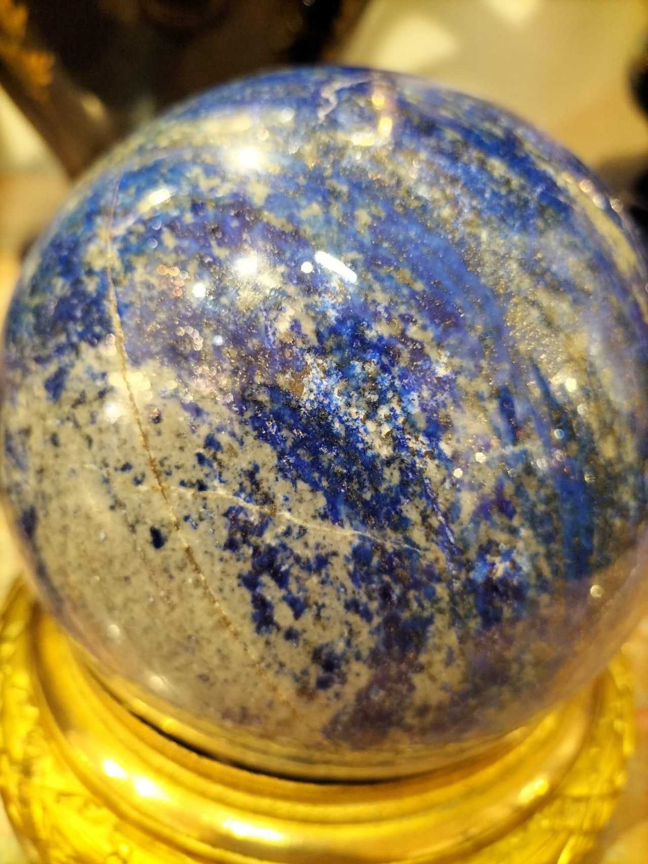 We are delighted to present you with this incredible polished sphere of Lapis Lazuli, a deep blue metamorphic rock often used in jewelry and decoration.The sphere displays a vibrant mix of blue hues, interspersed with veins of white calcite and specks of golden pyrite, which are characteristic of high-quality Lapis Lazuli.The stone is mounted on a 19th century bronze gilded base.The natural beauty and unique patterning of this stone makes it a striking decorative piece that would enhance any living space.