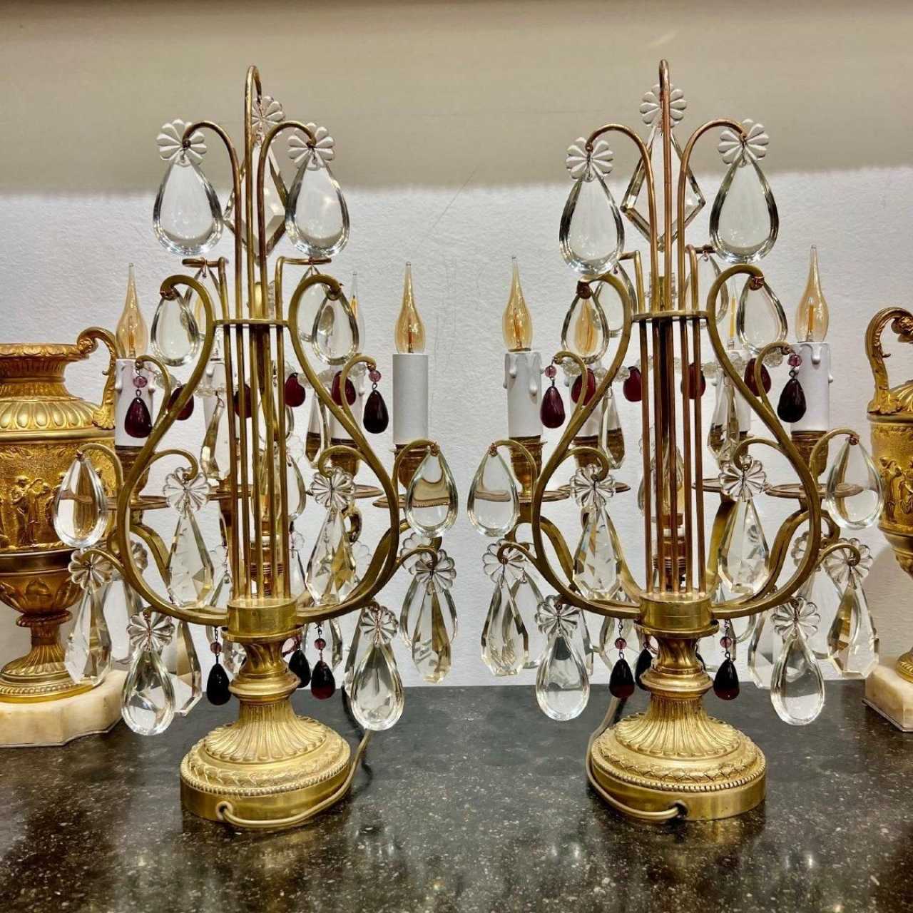 Late 19th Century Pair of Lyre Shaped Four-Light Candelabras Crystal bronze Late 19th century