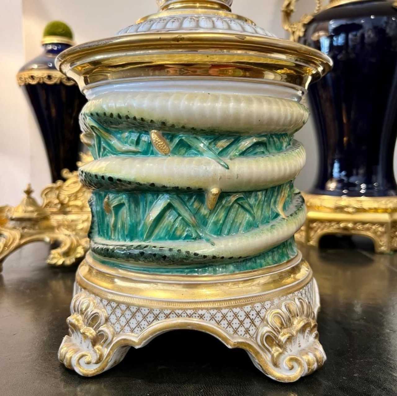 We are delighted to present you with this unique find- an exceptional pair of Parisian porcelain serving bowlsplatters, boasting an intriguing design with eels gracefully coiling around the bases. These 32 cm diameter platters are adorned with lovely floral bouquets, complemented by fresh gilding, presenting an overall flawless condition. These platters are perfect for decorating a table setting or serving as a decorative centrepiece on a console or dresser. Originating from the late 19th century, this pair exudes timeless elegance.
