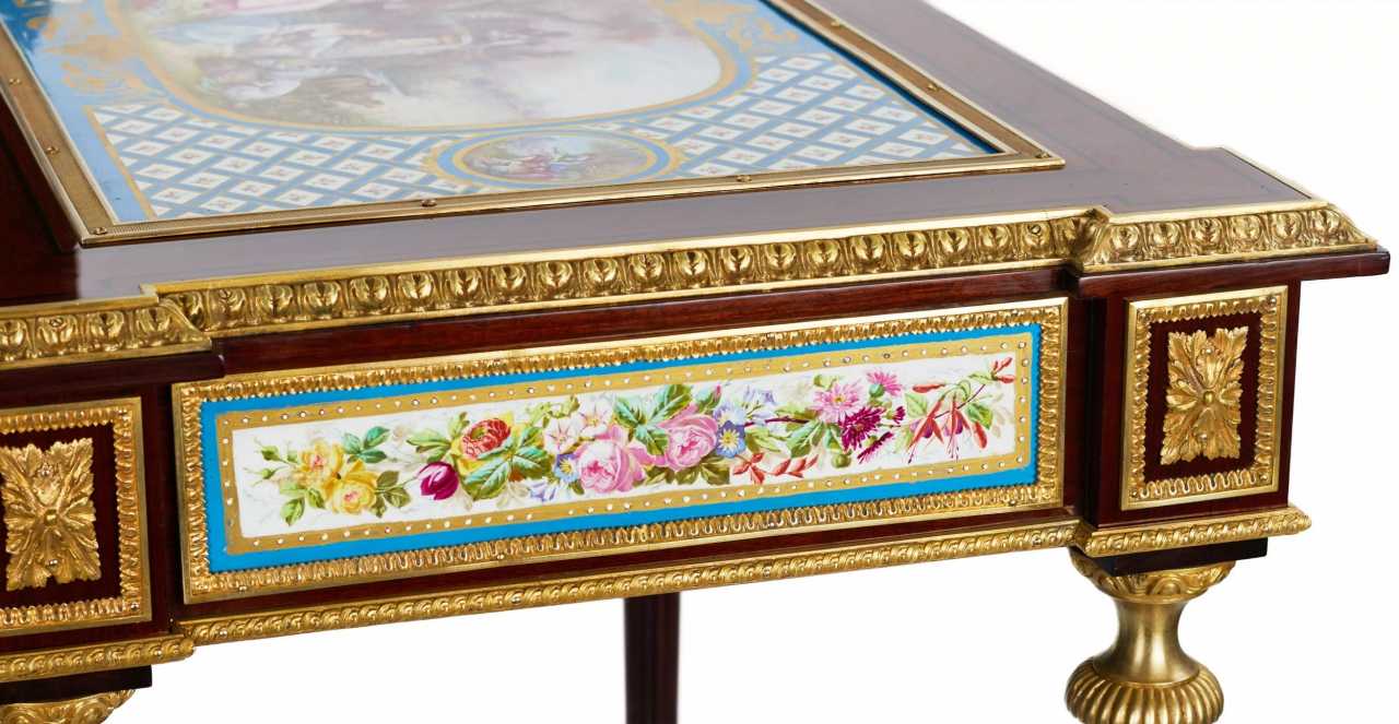 Magnifique table de dame de l’époque Napoléon III, réalisée en France dans la seconde moitié du XIXe siècle dans le style raffiné du célèbre ébéniste Adam Weisweiler (1746-1820). Sa structure rectangulaire avec projections d’angle, pieds cannelés et traverses arquées reflète les traditions du classicisme tardif, réinterprétées à travers l’esthétique somptueuse du Second Empire.L’élément principal est son rare plateau en porcelaine de 35 x 58 cm, couvrant presque entièrement la surface supérieure. Exécuté dans le style de la Manufacture royale de Sèvres, il représente une grande scène pastorale galante: bergères et berger près d’une source au bord d’un lac, peinte en polychromie délicate. Un décor en résille avec fleurs miniatures et médaillons circulaires illustrant des allégories de l’amour complète l’ensemble.Le bandeau est orné de panneaux en porcelaine représentant des scènes de promenades et de conversations galantes, dans l’esprit des peintres français du XVIIIe siècle. Des compositions florales allongées ornent les côtés. Les bronzes dorés - feuilles d’acanthe, couronnes de laurier, perles et guilloché - unifient l’ensemble dans une harmonie décorative.Le tiroir est doté d’une serrure secrète, caractéristique du mobilier raffiné destiné aux boudoirs féminins. La table constitue une rare synthèse de la rigueur classique et de la grâce rocaille, formant un élément remarquable d’un intérieur aristocratique.Dimensions: Hauteur 81 cm; largeur 80 cm; profondeur 55.5 cm.État: Très bon état. Dorure préservée. Légères traces d’usage. Panneaux en porcelaine sans fissures ni restauration.Provenance: Collection particulière européenne.