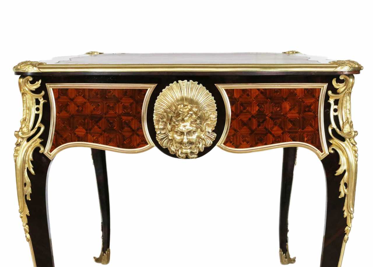Magnifique table en bois et bronze dore de style Louis XV. Alliant une ligne fine de mesure et d`elegance. Suffisance decorative et fonctionnalite. Élevation representative et confort de la chambre. La structure melodieuse des vagues et des coquillages en germination, les accords des mascarons sur l`efficacite losangique de la marqueterie - plongent dans l`atmosphère de l`epoque courtoise, où le monde objectif desincarnait la richesse des mouvements internes humains. Decor double face. France 19ème siècle. 77x133x78cm.