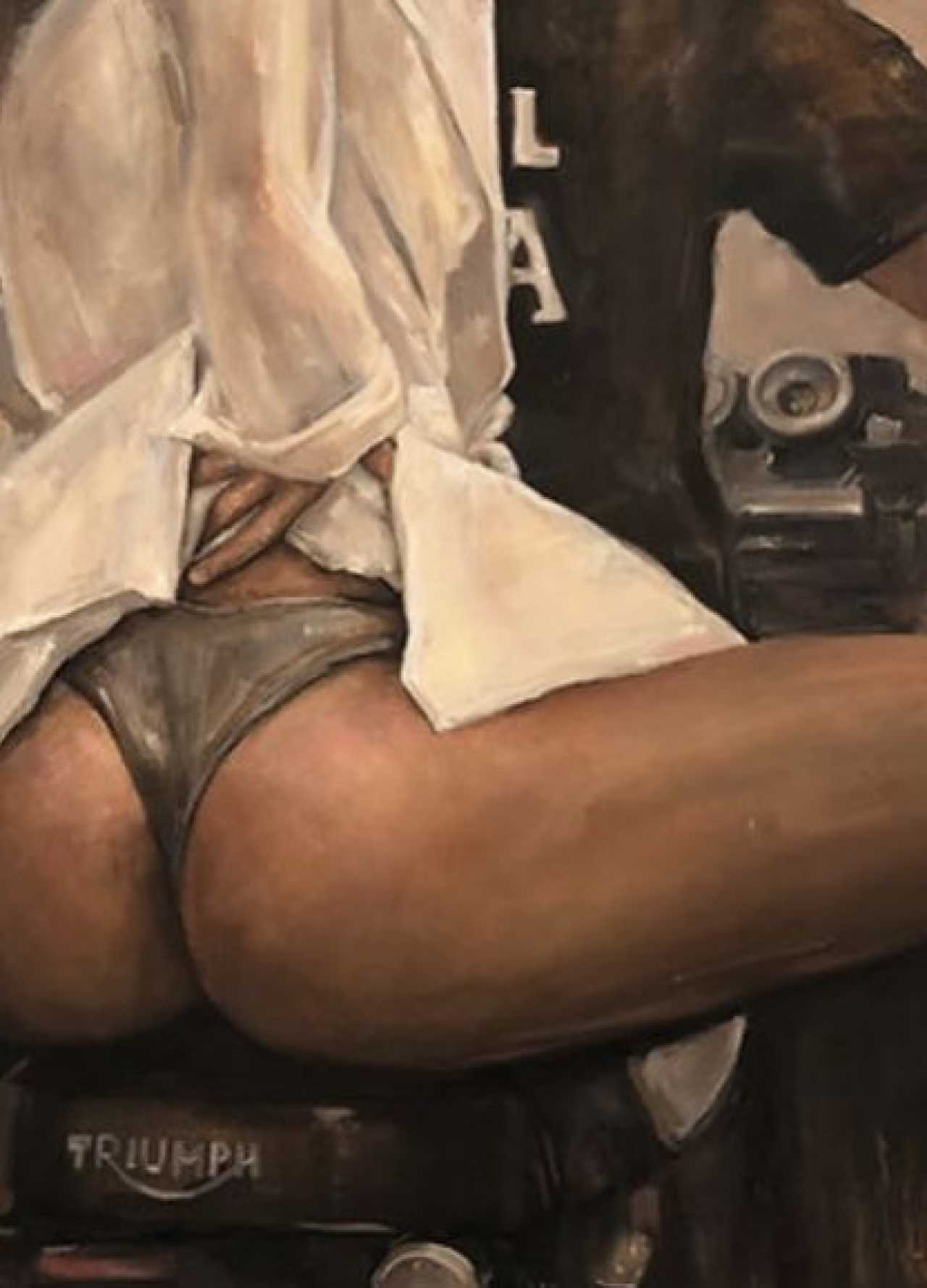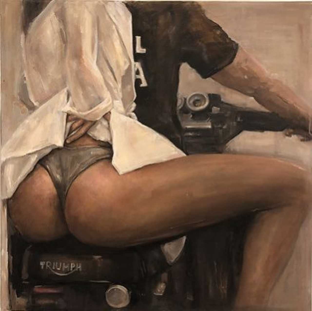 Meryem Tayganskaya, originaire de Crimée, est une artiste talentueuse qui a suivi huit années d&39;études artistiques formelles, notamment dans une université d&39;art. Résidant actuellement à Oslo, elle est connue pour ses peintures à l&39;huile sur toile sensibles, qui ont gagné en popularité dans les pays scandinaves. Meryem participe activement à des événements artistiques et reste engagée dans les tendances de l&39;art contemporain, faisant évoluer continuellement sa pratique artistique. Cette peinture à l&39;huile montre une fille assise à l&39;arrière d&39;une moto Triumph derrière son petit ami, dos au spectateur. Elle porte une chemise blanche et ses sous-vêtements sont visibles en dessous. Le tableau dépeint un sentiment de liberté et d&39;évasion, la fille profitant du moment et du frisson du voyage. Le fond du tableau est gris atténué, ce qui contribue au sentiment de calme et de simplicité de la scène. Les coups de pinceau sont audacieux et expressifs, donnant une impression de mouvement et d&39;énergie. Dans l&39;ensemble, cette peinture à l&39;huile capture un moment de joie insouciante, soulignant la beauté de vivre l&39;instant présent et de profiter des plaisirs simples de la vie. Les dimensions sont de 50 x 50 cm. Huile sur toile.