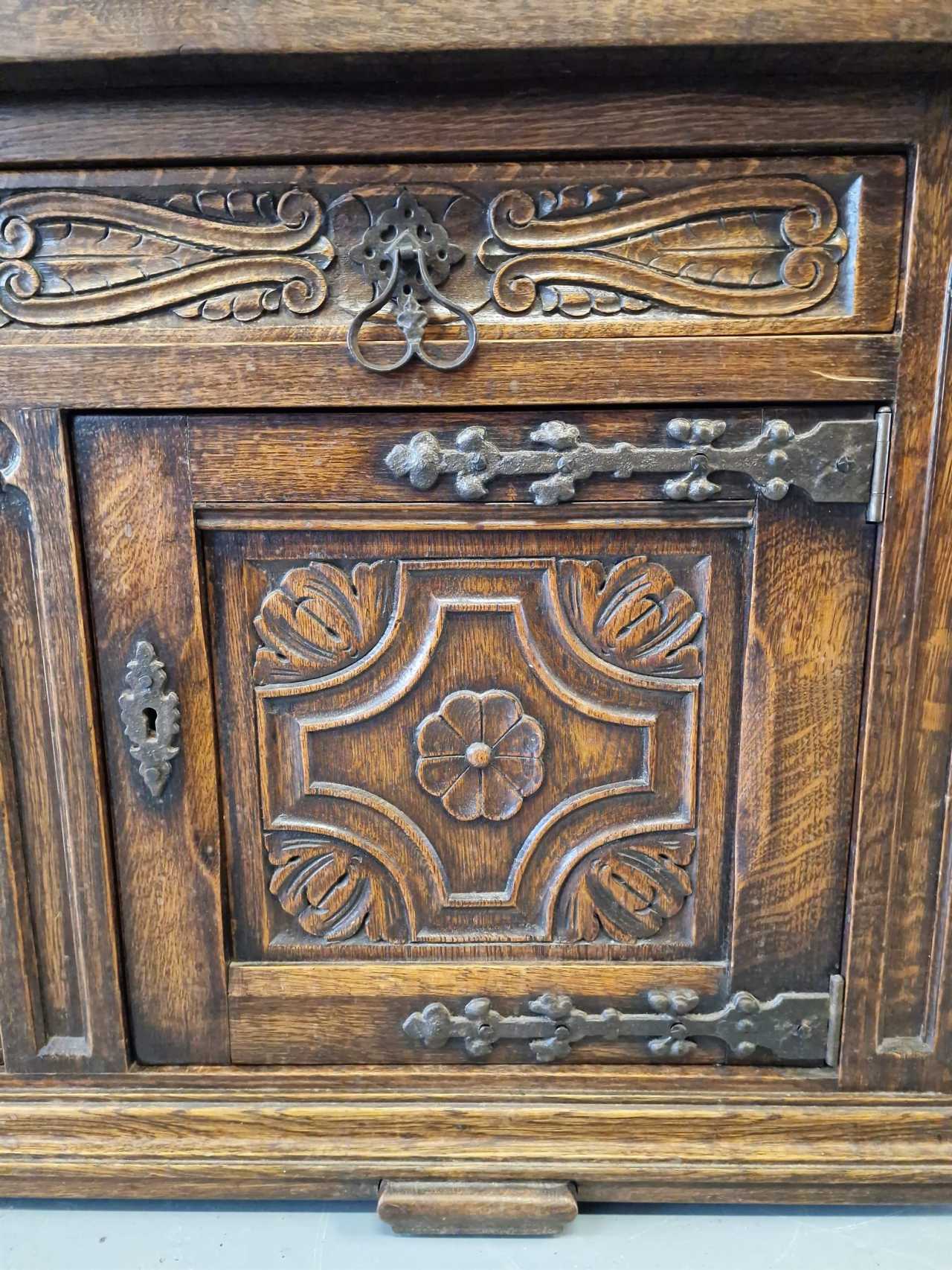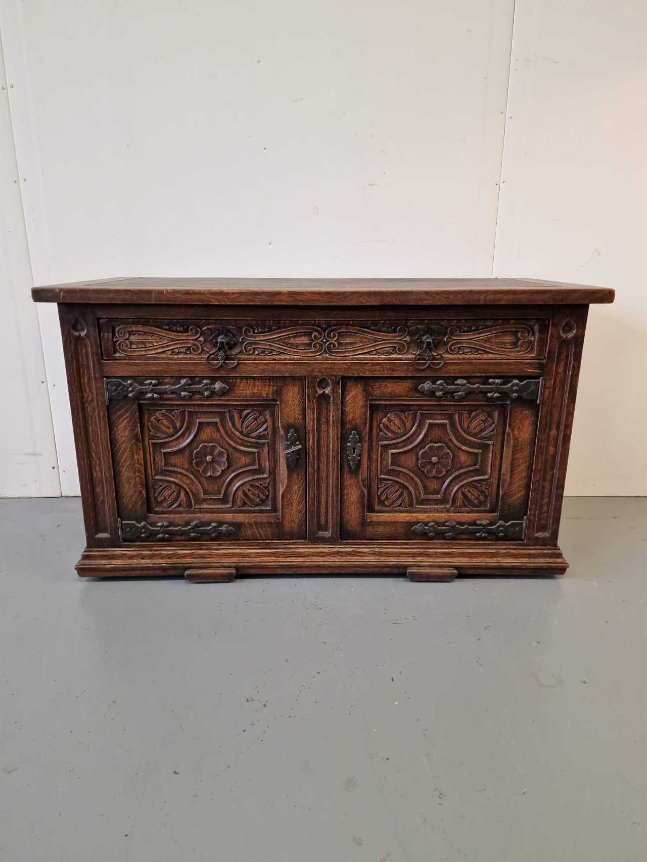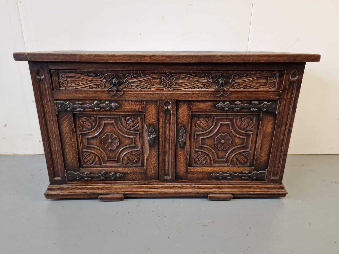 Meuble en chêne. Belles sculptures sur bois. France. Années 1950. Dimensions : hauteur 61 cm ; longueur 106 cm ; profondeur 48 cm.