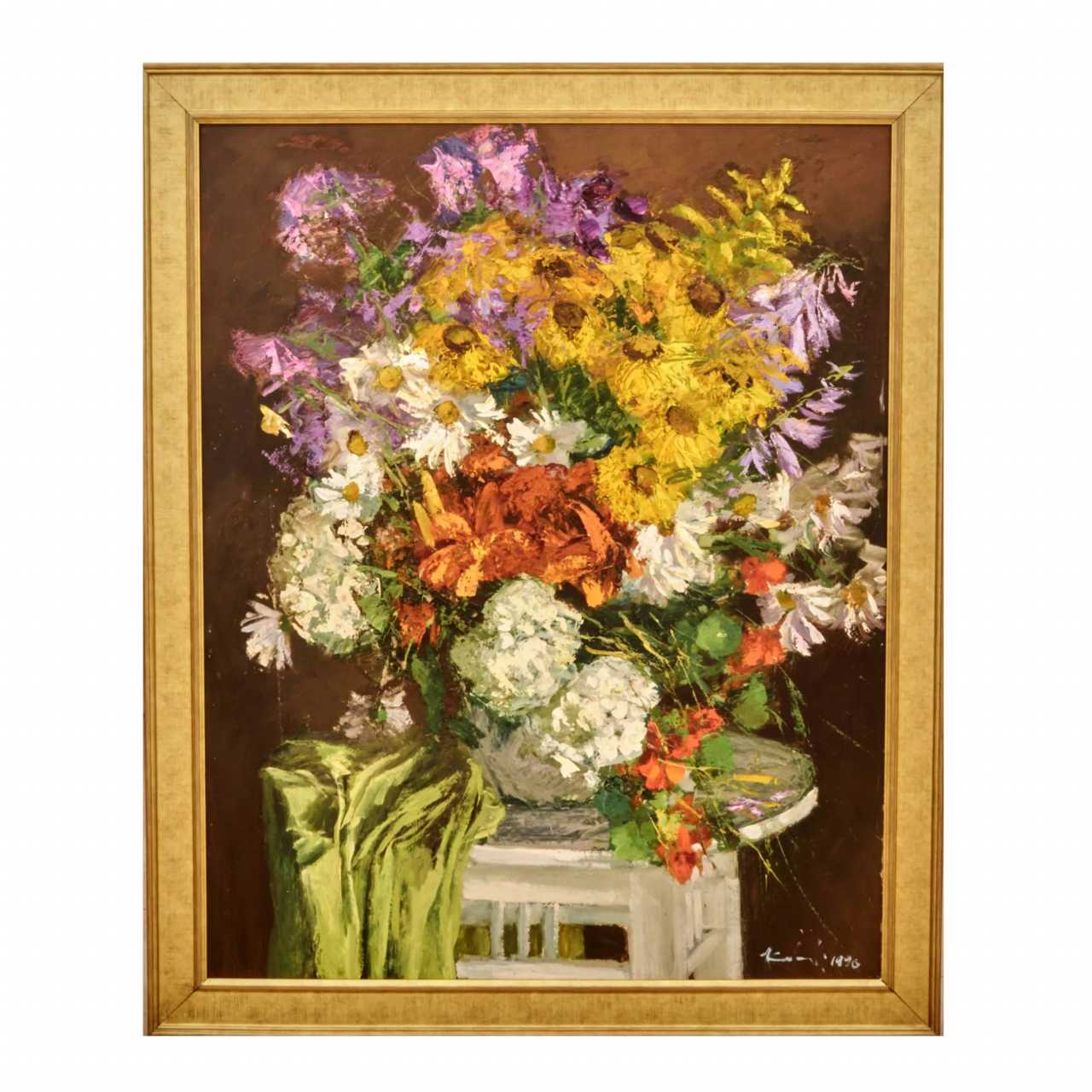 Œuvre lumineuse et decorative de Janis Kalnmalis Fleurs d`automne (Jānis Kalnmalis), 1996. Huile sur panneau de fibres, 88,5x79,5 cm Signature en bas à droite. Artiste polyvalent, diplôme de l`Academie des Arts de Lettonie, atelier Ed. Kalninsha. Peintre paysagiste original, maître de la nature morte.