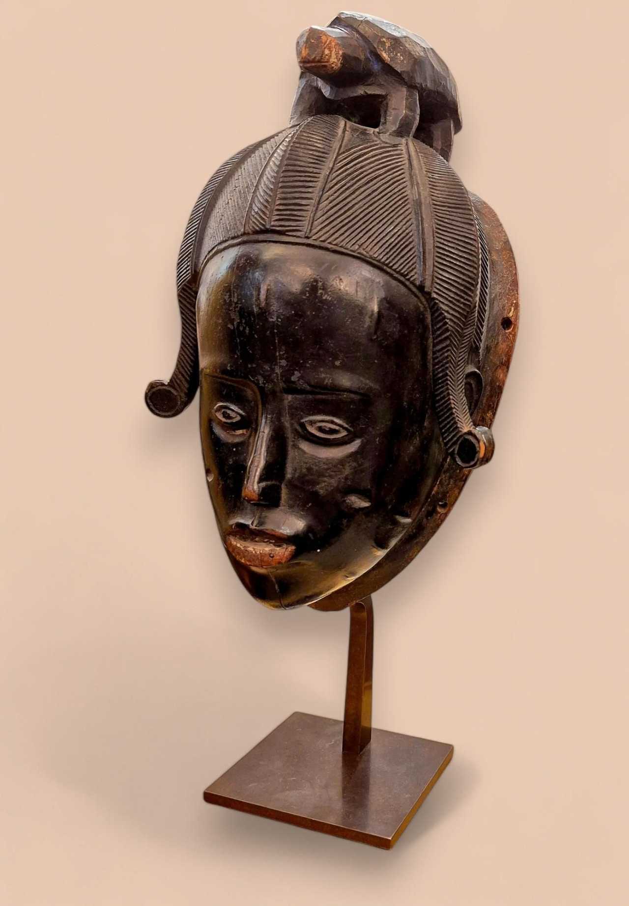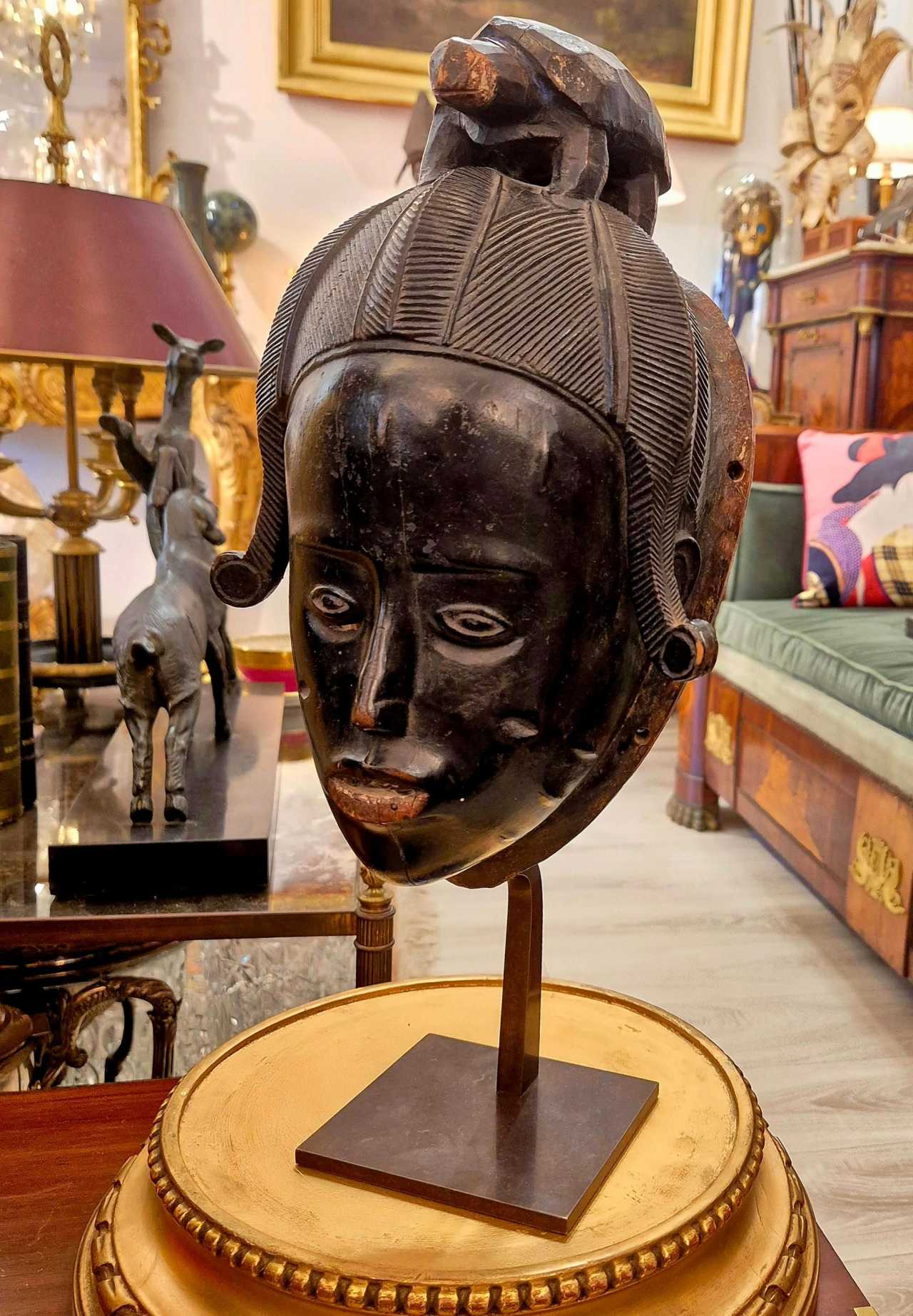 Ndoma” Baule Portrait Mask, Ivory Coast, Circa 1930 Wood, heavy wood with deep brown-black lacquered patina.A superb old hardwood dance mask featuring an elegant, elongated female face with the fine, refined features characteristic of Ndoma Baoulé portrait masks.Ndoma portrait masks are the last figures to appear during entertainment ceremonies at dusk. Commissioned from a sculptor by one or more admirers, these masks are fashioned to pay tribute to a member of the community and celebrate his or her exceptional qualities: whether the beauty and elegance of a woman, the wisdom and experience of an elder, or the dexterity of a skilled hunter. When they are performed, the wearer of the ndoma mask is usually accompanied by the person he or she is honoring (or a substitute), and may sometimes wear clothes belonging to that person.This person, adorned in his or her most sumptuous finery, twirls around him or her, perfuming the air, covering the floor with fabric where the dancer moves, and behaving towards his or her double like a mother towards her child, in a gesture imbued with veneration and tenderness.Here, the central crest hairstyle is framed by two lateral braids and topped by a turtle (which retains traces of blue pigment), while the forehead and cheeks are marked by protruding keloids. The slightly raised superciliary arches extend into a long, slender nose and a mouth revealing two rows of filed teeth, as was customary among women before the 1920s. The straight, very fine nose and prognathic mouth are other classic features of Baule masks.Also noteworthy is the superb brown-black lacquered patina.