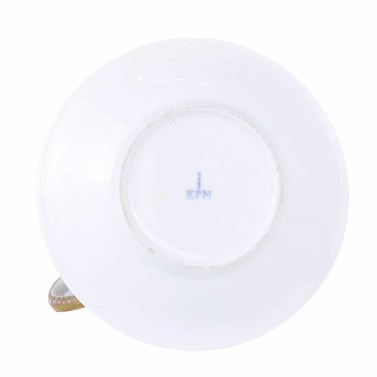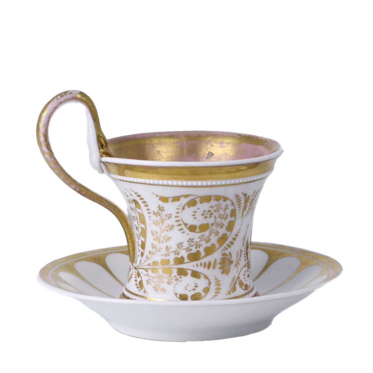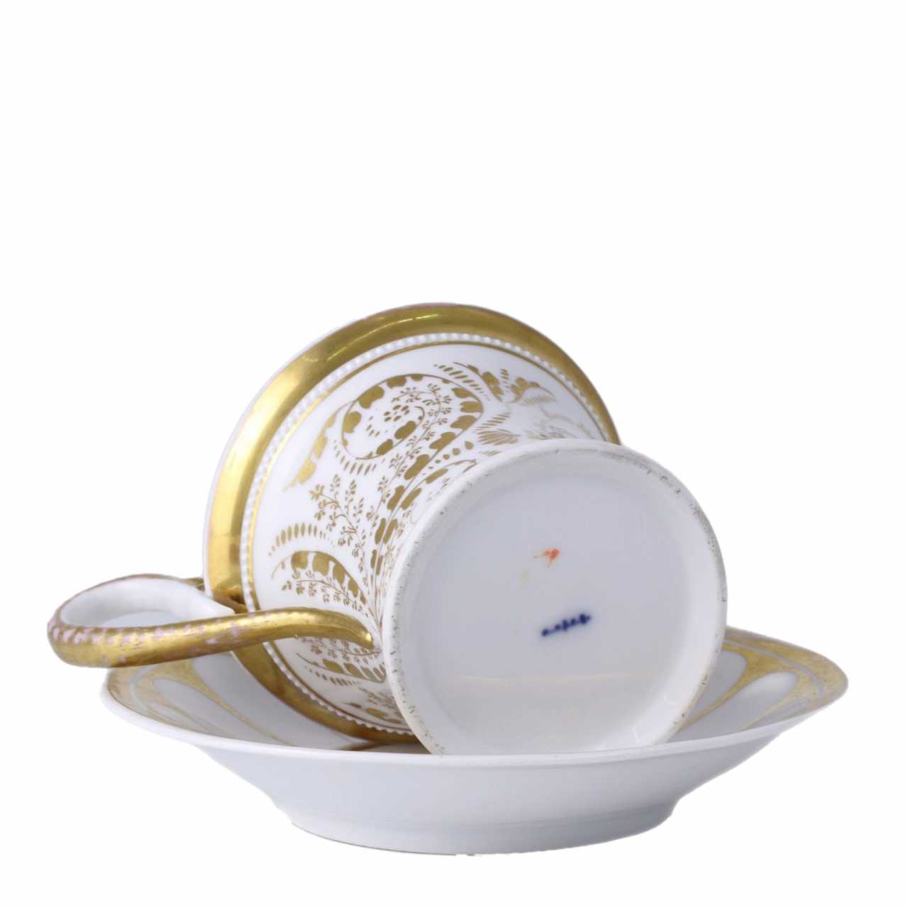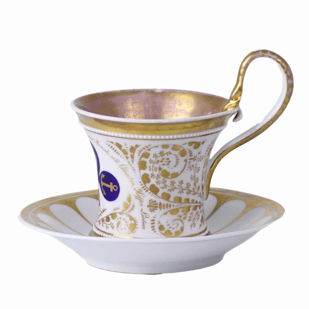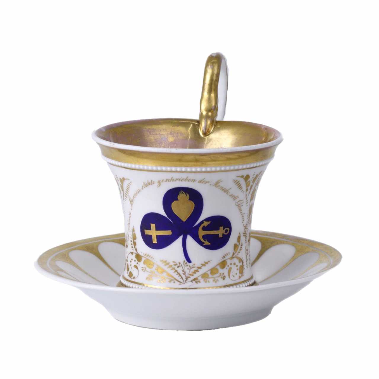 Paire de cafe en porcelaine KPM, motif or avec texte et symboles daffection du cœur: croix, cœur, ancre dans un trèfle.Marque du fabricant: KPM. 19 siècle, H-12cm.