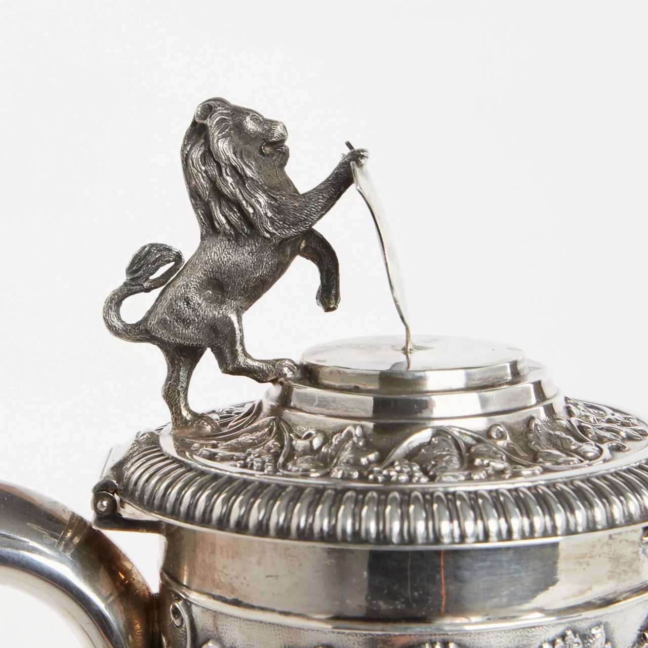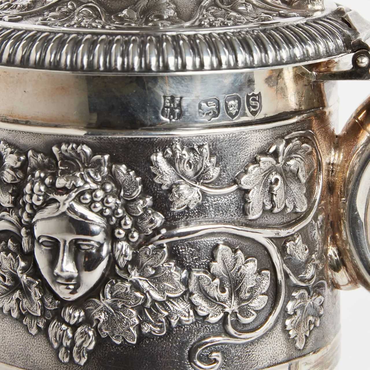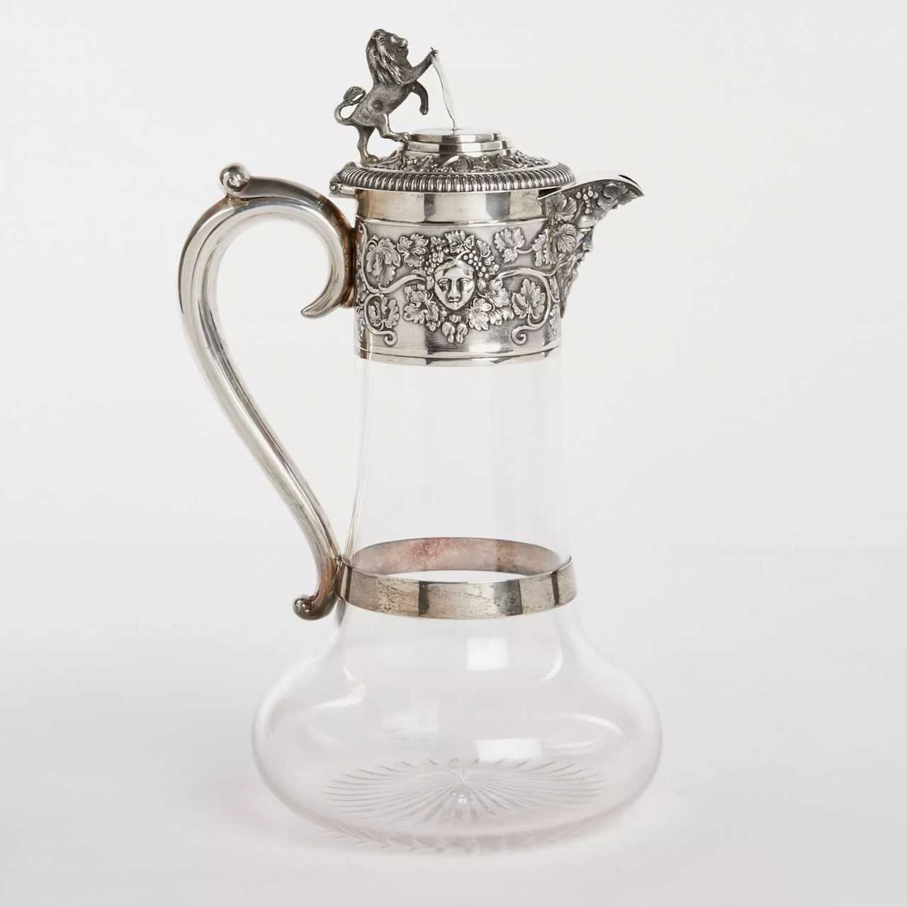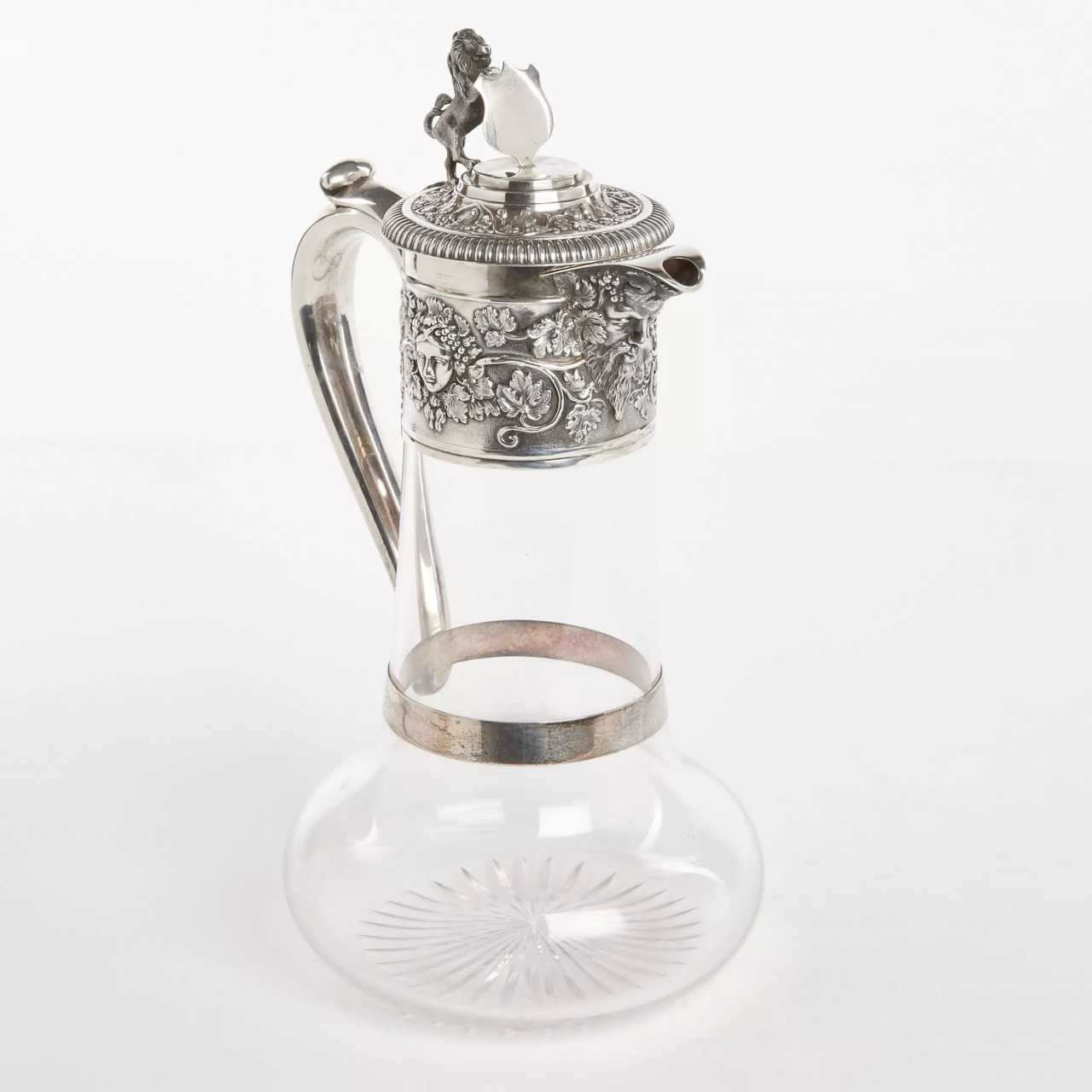 Pichet à vin en argent avec verre decore d`un decor de mascarone sur le col et d`un motif rocal d`un regard de raisin. Le haut du couvercle de la cruche est couronne de la figure d`un lion tenant un bouclier. Poinçons anglais en argent : Horace Woodward & Hugh Taylor, Londres 1893.