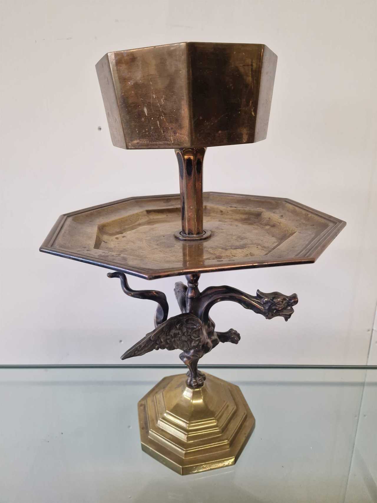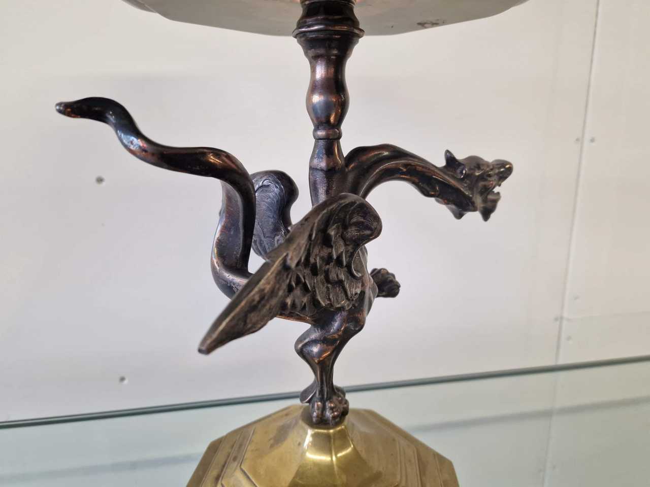 Plat de service en bronze ancien. Dragon en bronze argenté. France. Années 1920. Hauteur 50 cm ; 34 x 34 cm.