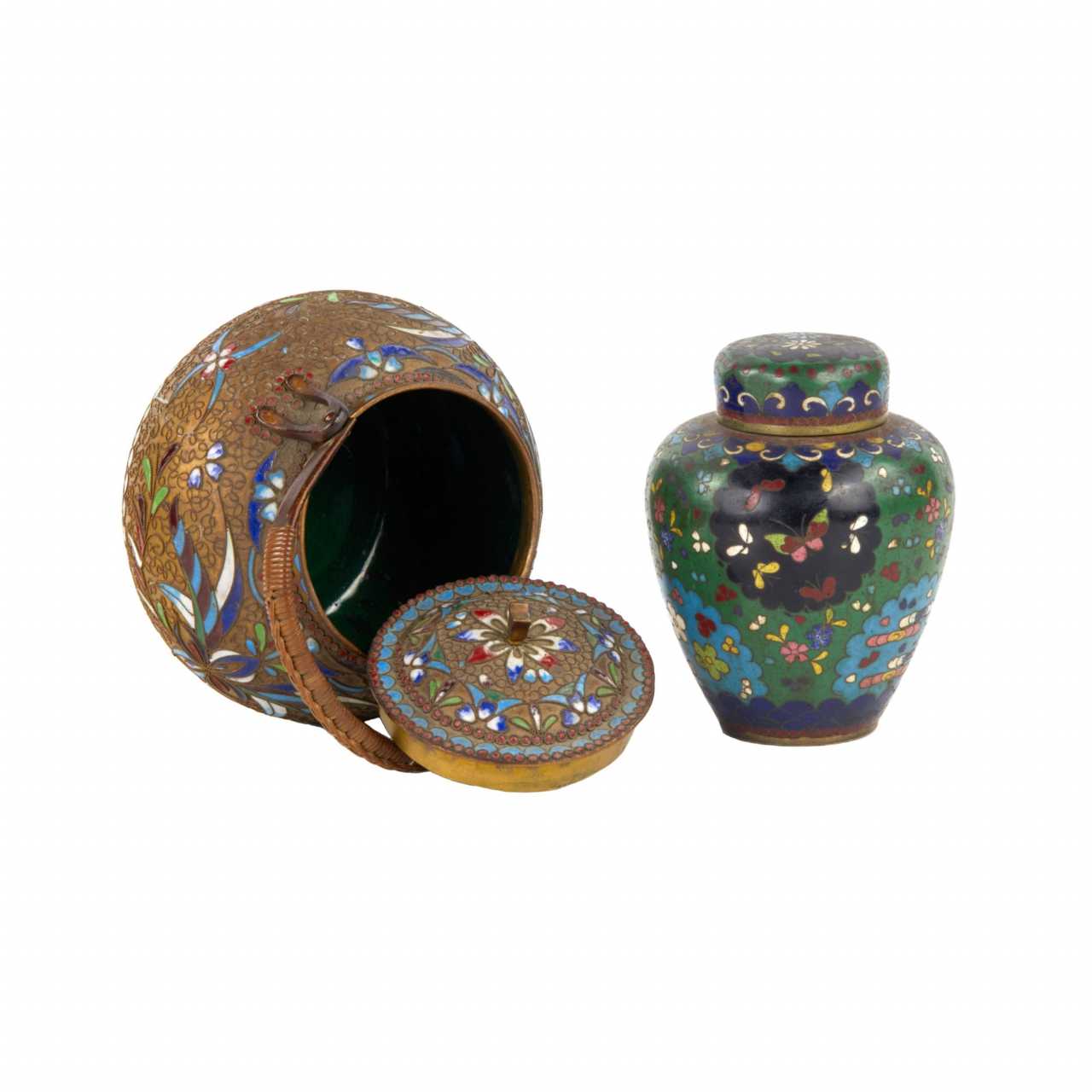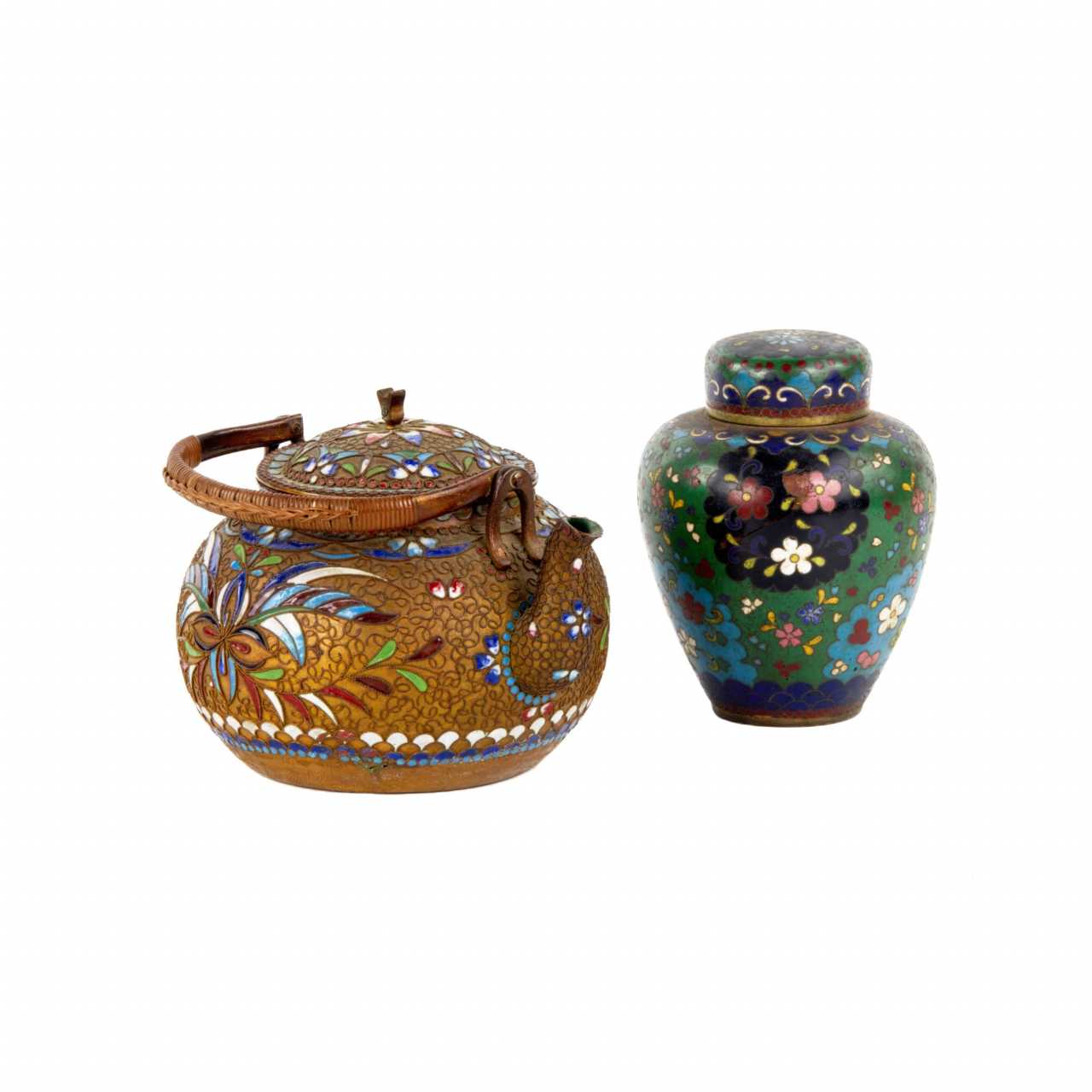 Quelques articles pour la ceremonie du the. Theière en email cloisonne avec anse en osier et caddie cloisonne, debut XXème, legèrement abîmee.