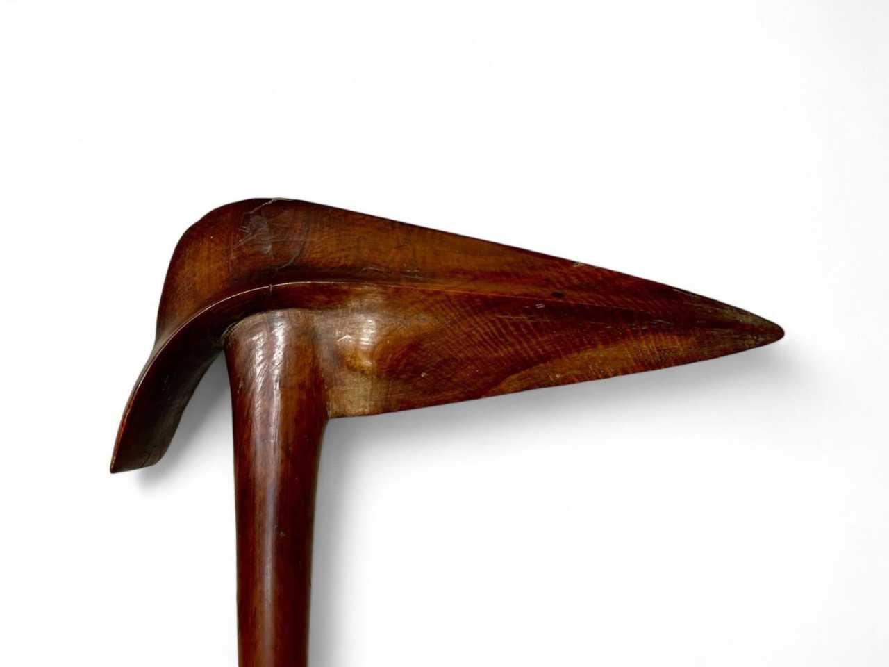 Rare Kanak war club of the Kagu type (Birds beak) in hardwood, from New Caledonia, Melanesia, 19th century.This is an exceptional Kanak art collectors item due to its imposing size and its rare balance on this type of object.This ancient combat tool, carved in a beautiful solid hardwood decorated with a magnificent dark brown and shiny patina, is distinguished by its long cylindrical handle which ends in a stylized birds head, with an elongated beak, two raised eyes and a crest falling at the back of the neck.The handle reflects the traditional style of Kanak clubs. Clubs are an integral part of the Kanak arsenal. Although several forms exist, the most widespread are divided mainly into two categories: phallic brain teasers and those in the shape of a birds beak or turtle.Their use for war and dances is omnipresent throughout New Caledonia. According to Maurice Leenhardt, these objects are used to express virility during war speeches, an essential aspect of the oral tradition. The different forms do not correspond to a specific use, but reflect regional styles, each socio-political group imprinting its identity on the objects it uses.These clubs were brandished during the pilous, in particular for the declamation of genealogical speeches, symbolizing masculine virility and power. A drawing in Indian ink on tracing paper, made around 1954, attests to the objects collected before 1900 by the curator Bernier for the New Caledonian Museum. This model of Kanak puzzle, called “phallic”, represents a formidable weapon used in close combat in New Caledonia.