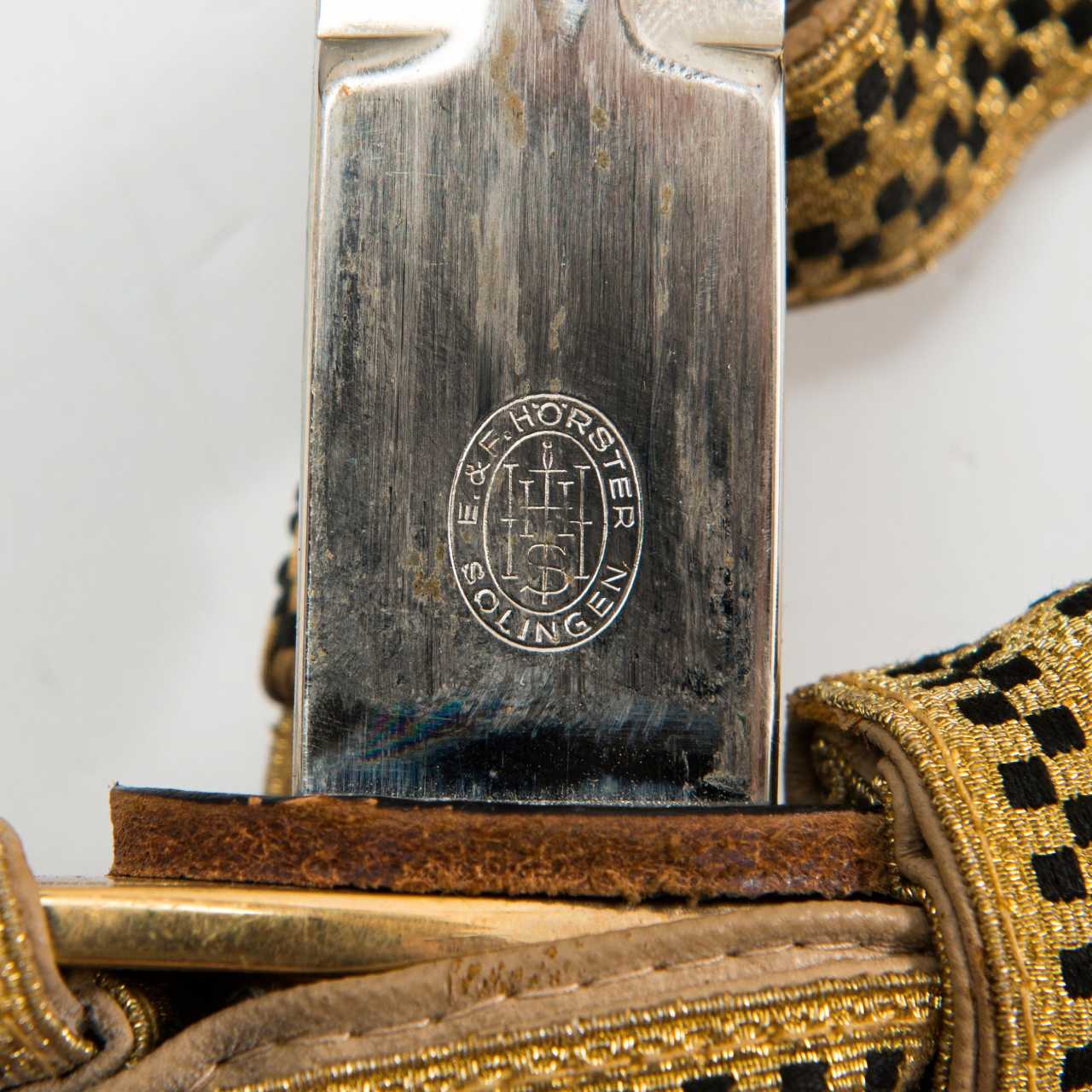 Sabre de parade d`officier de marine finlandais. Le deuxième quart correspond au milieu du 20e siècle. Le manche est en laiton dore. La poignee incurvee est decoree des armoiries de la Finlande. Lame en acier marquee E&F Hörster Solingen. Fourreau en cuir cousu avec garniture en laiton dore. Longueur de la lame 77,5 cm.