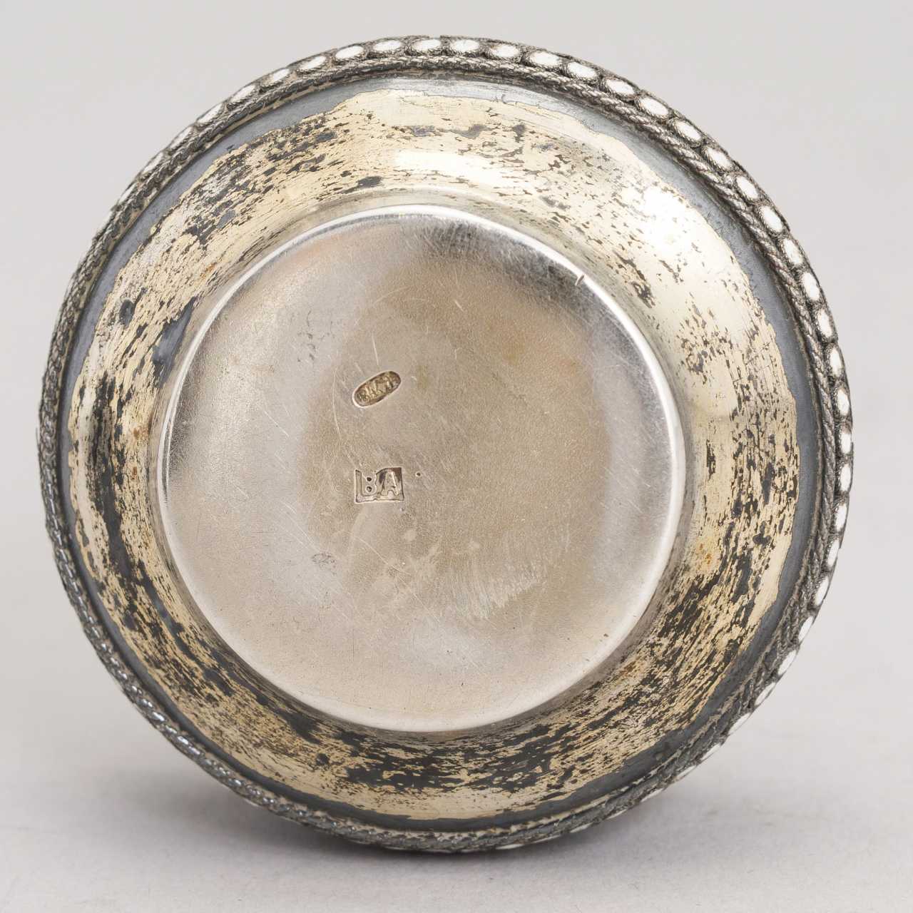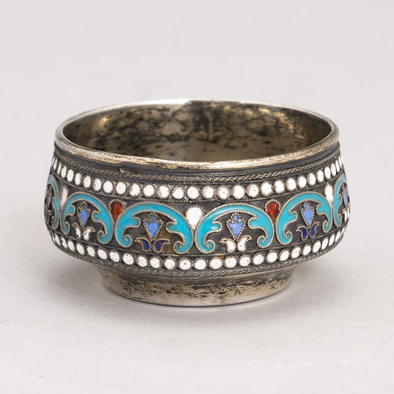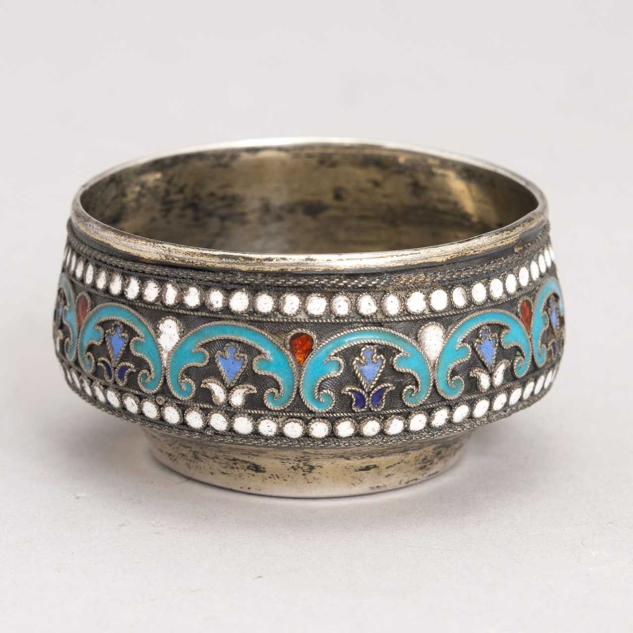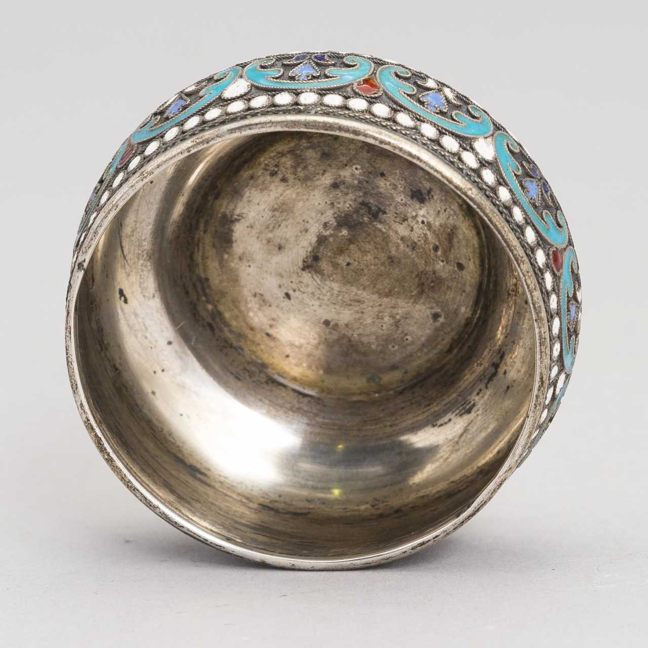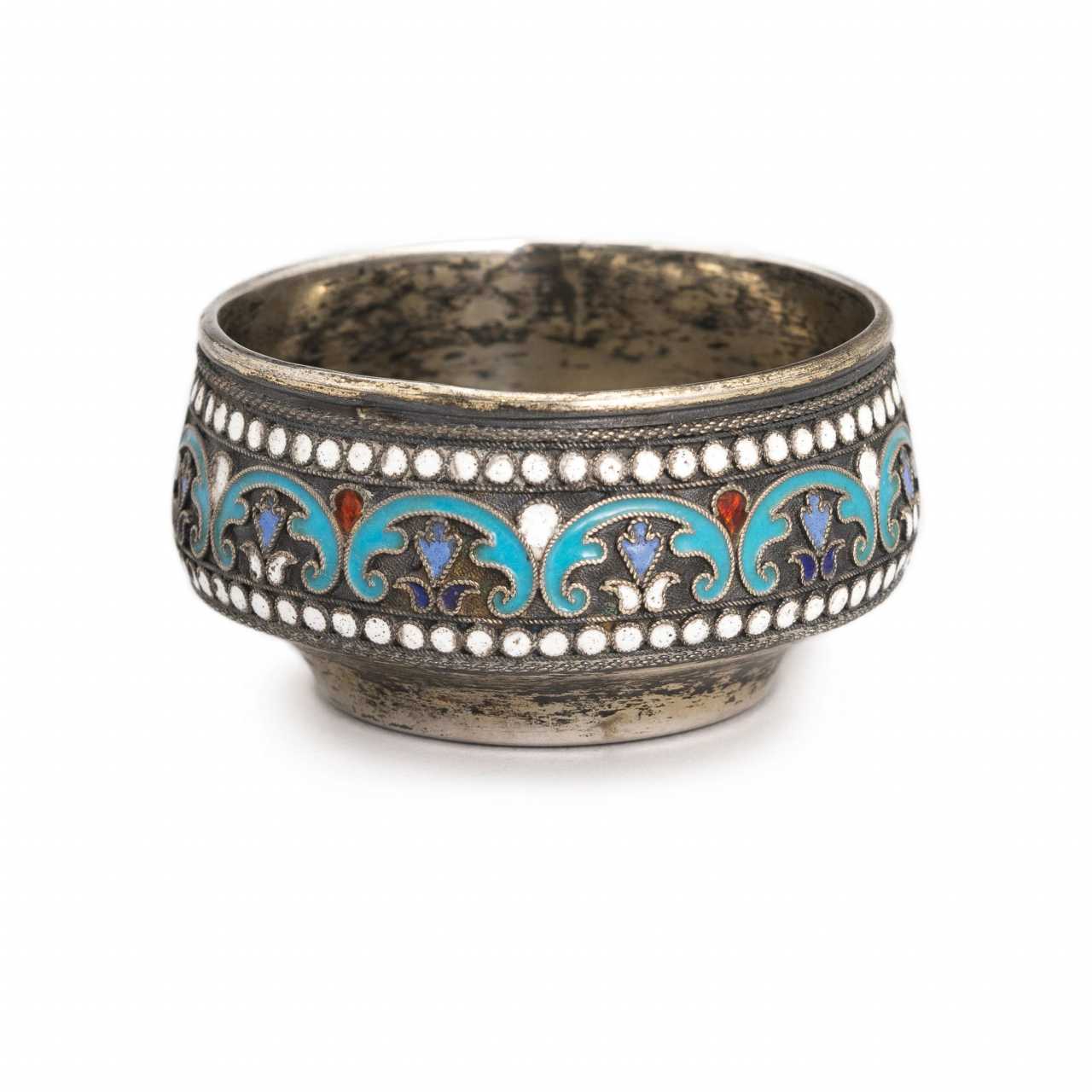 Salière en argent, decoree d`un decor vegetal artistique realise selon la technique de lemail cloisonne, d`orure residuelle. Diamètre 5,5 cm Poids: 54 g.Timbre: 84 une fille en kokoshnik tournee vers la gauche dans un bouclier ovale, un immense du maître de la lettre VA dans un bouclier rectangulaire.
