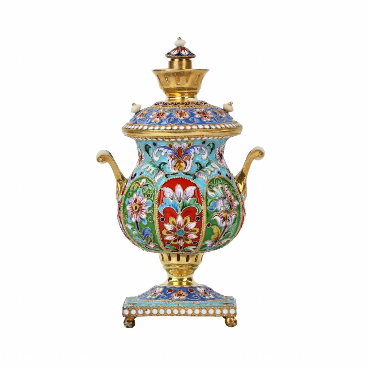 Samovar en argent dore et emaux peints. Timbre 84. Poids : 155 gr. Hauteur : 11 cm.