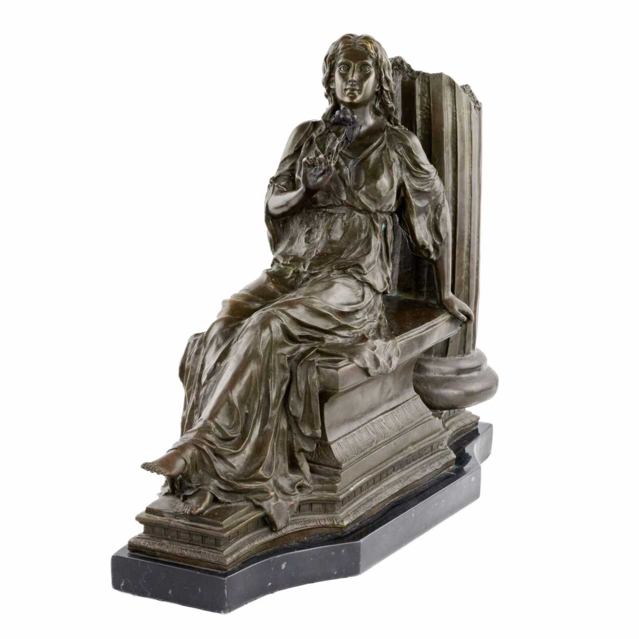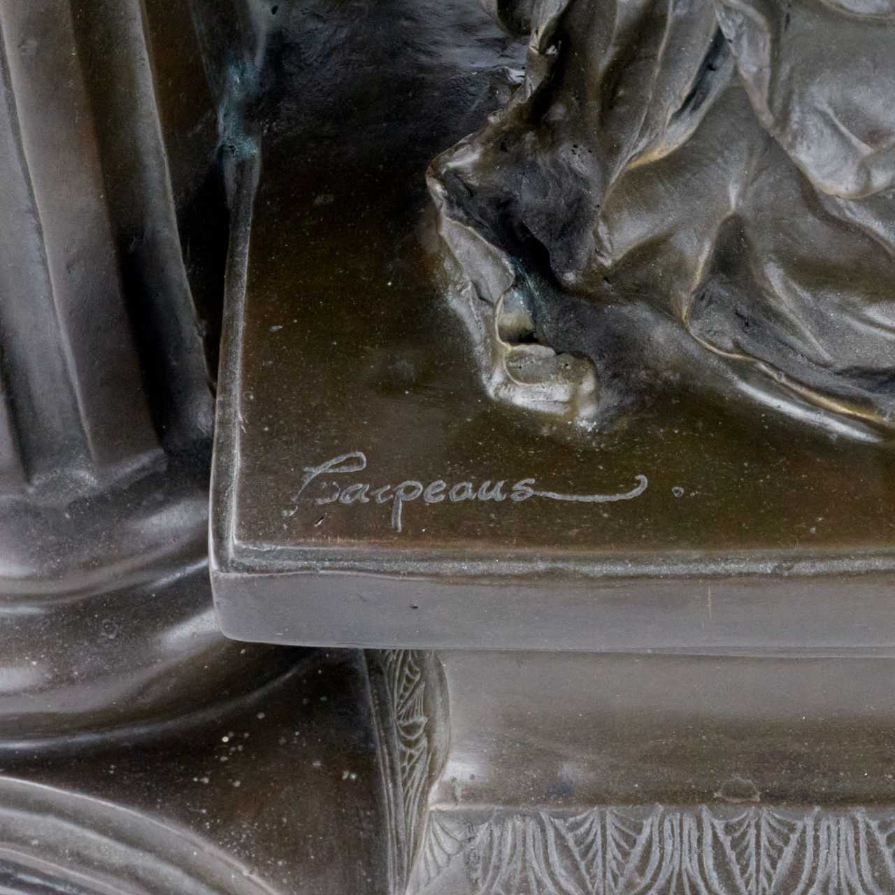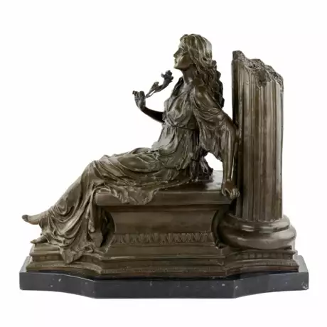 Complexe commemoratif en bronze Fille à la rose. Montre une fille dans des souvenirs romantiques à l`epave d`une colonne, assise sur un sarcophage. Elle respire les vibrations de l`amour effondre et enterre. Toute expression sensuelle des souvenirs vivants s`exprime dans les plis des vêtements et des cheveux. La sculpture est posee sur un socle en pierre. Signature : Carpeaux. De Jean-Baptiste Carpeaux (1827-1875). H-45cm.