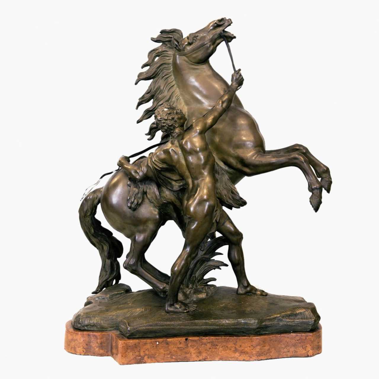 Sculptures jumelees Horse Tamers ou Marley Horses. Le groupe sculptural en marbre Horse Tamers a ete cree en 1740-1745. Guillaume Coustou l`Ancien (Guillaume Coustou I, 1677-1746) - un celèbre sculpteur français de la première moitie du XVIIIe siècle, qui a travaille à la decoration des palais et des parcs de Versailles, Marly, Tuileries et Trianon. Les sculptures ont ete commandees par Louis XV en marbre de Carrare pour decorer la terrasse du château de Marly en banlieue parisienne. Lassee des images officielles tendues, l`administration royale chargea le sculpteur de representer des figures de jeunes nus retenant des chevaux cabres. Provenance : Archives photographiques d`une collection privee. Les sculptures faisaient partie d`une collection privee situee dans le Palais du Liechtenstein. Stadtpalais Wien, Schloss Vaduz, Liechtenstein, 1945.