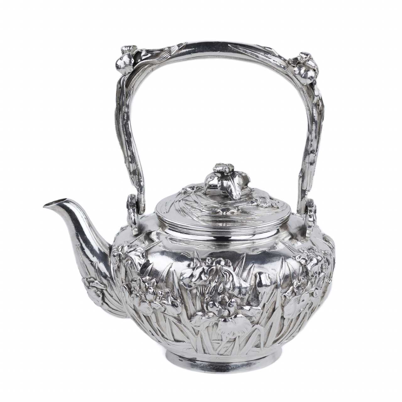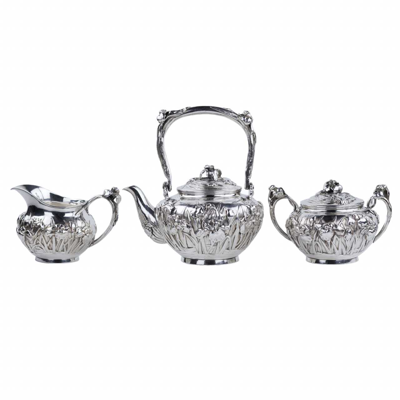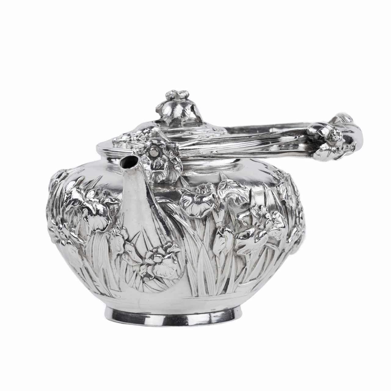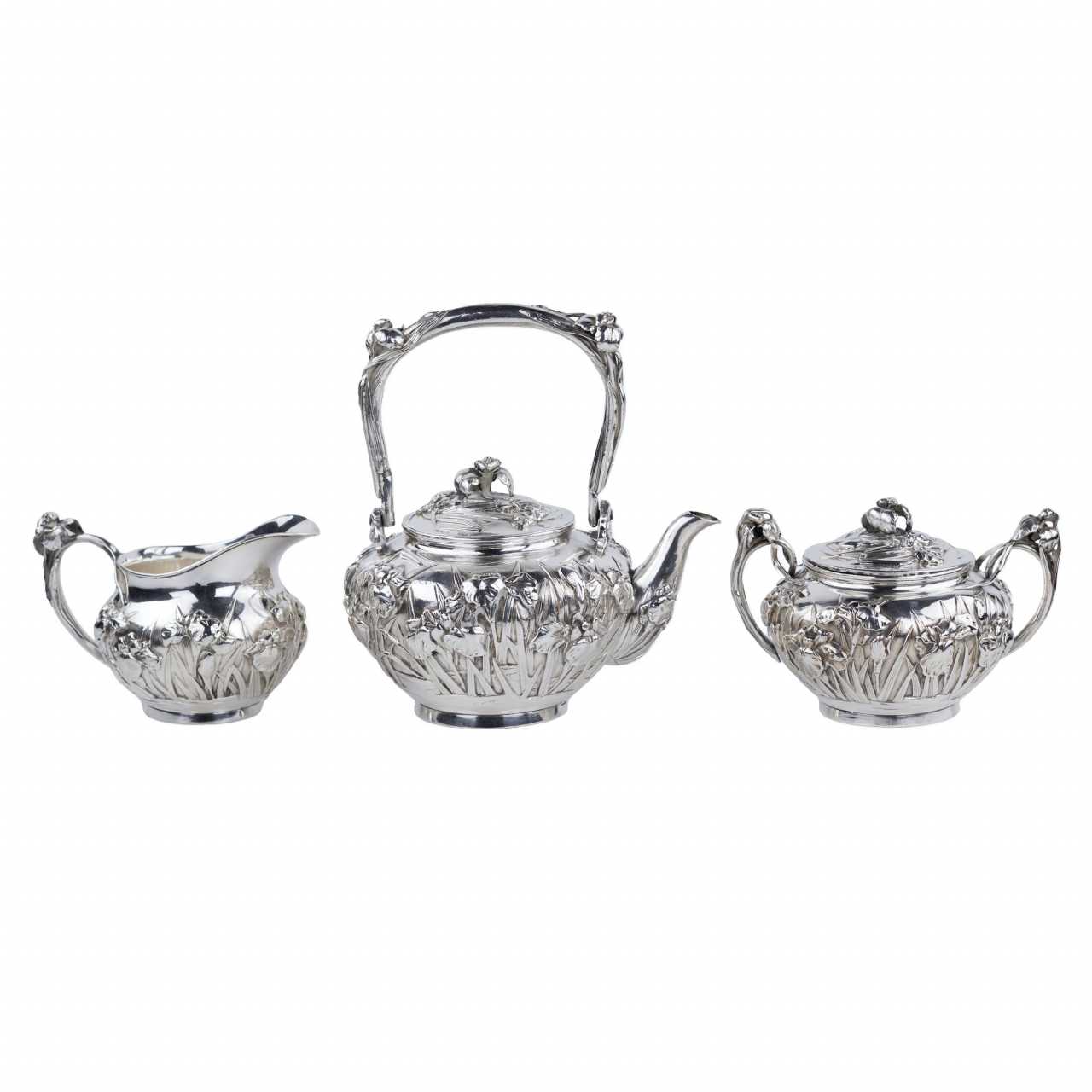 Rare service à thé japonais en argent de la période Meiji, travaillé dans un argent de haute qualité avec un niveau exceptionnel de finesse sculpturale. L’ensemble comprend trois pièces : une théière avec anse arquée mobile et bec courbé, un sucrier à deux anses avec couvercle, et un pot à crème. Tous les éléments sont décorés d’un riche motif en relief de fleurs d’iris — symbole majeur de l’art décoratif japonais.Le décor floral enserre les pièces dans leur totalité, créant un effet organique et rythmé. Les couvercles sont ornés de boutons floraux, prolongeant le motif principal dans une harmonie esthétique complète. Les pétales et tiges sont traités avec un modelé profond, accentuant les reflets de la lumière sur la surface de l’argent.Les anses et les becs présentent des détails floraux parfaitement intégrés à la forme générale, témoignant d’un savoir-faire orfèvre raffiné. L’intérieur des pièces est soigneusement poli.Chaque pièce porte deux poinçons bien visibles :– 純銀 (jungin — argent pur),– 有民 (Yūmin) — signature d’un maître orfèvre actif à Tokyo ou Yokohama à la fin du XIXe siècle, spécialisé dans les pièces d’exportation artisanales.Un chef-d’œuvre de l’orfèvrerie japonaise du XIXe siècle, alliant précision technique, symbolisme et équilibre esthétique.Poinçons :純銀 (argent pur), 有民 (Yūmin)Dimensions :Théière : 10 × 10 cm; Sucrier : 10 × 10 cm; Crémier : 10 × 10 cmPoids :Total : 1 296 gÉtat :Bon état avec légères traces d’usage. Argent intact, relief profond, poinçons nets. Bel exemple de l’orfèvrerie japonaise de la fin de l’époque Meiji.Provenance :Collection privée