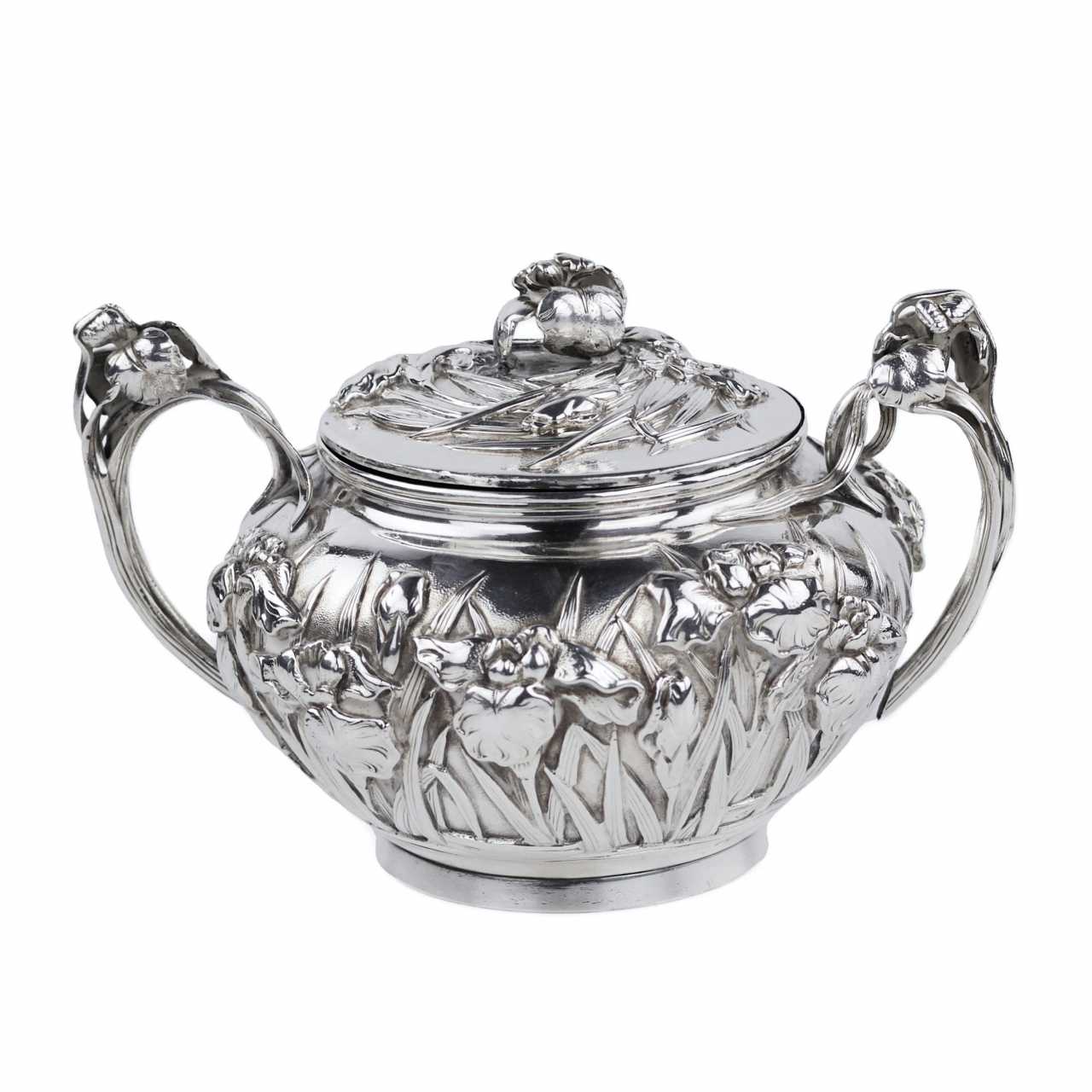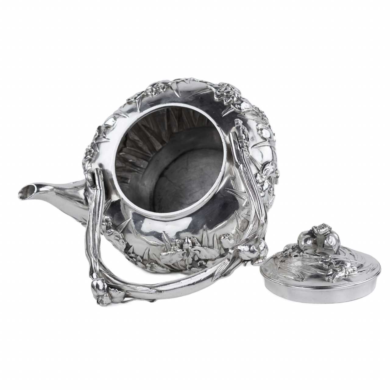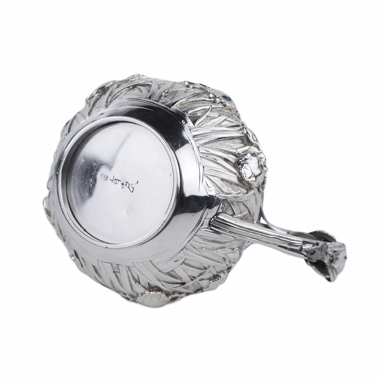 Rare service à thé japonais en argent de la période Meiji, travaillé dans un argent de haute qualité avec un niveau exceptionnel de finesse sculpturale. L’ensemble comprend trois pièces : une théière avec anse arquée mobile et bec courbé, un sucrier à deux anses avec couvercle, et un pot à crème. Tous les éléments sont décorés d’un riche motif en relief de fleurs d’iris — symbole majeur de l’art décoratif japonais.Le décor floral enserre les pièces dans leur totalité, créant un effet organique et rythmé. Les couvercles sont ornés de boutons floraux, prolongeant le motif principal dans une harmonie esthétique complète. Les pétales et tiges sont traités avec un modelé profond, accentuant les reflets de la lumière sur la surface de l’argent.Les anses et les becs présentent des détails floraux parfaitement intégrés à la forme générale, témoignant d’un savoir-faire orfèvre raffiné. L’intérieur des pièces est soigneusement poli.Chaque pièce porte deux poinçons bien visibles :– 純銀 (jungin — argent pur),– 有民 (Yūmin) — signature d’un maître orfèvre actif à Tokyo ou Yokohama à la fin du XIXe siècle, spécialisé dans les pièces d’exportation artisanales.Un chef-d’œuvre de l’orfèvrerie japonaise du XIXe siècle, alliant précision technique, symbolisme et équilibre esthétique.Poinçons :純銀 (argent pur), 有民 (Yūmin)Dimensions :Théière : 10 × 10 cm; Sucrier : 10 × 10 cm; Crémier : 10 × 10 cmPoids :Total : 1 296 gÉtat :Bon état avec légères traces d’usage. Argent intact, relief profond, poinçons nets. Bel exemple de l’orfèvrerie japonaise de la fin de l’époque Meiji.Provenance :Collection privée