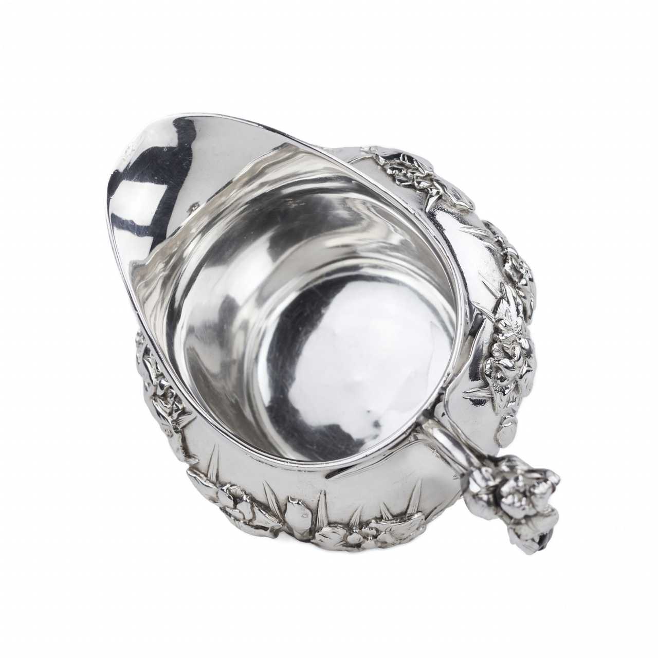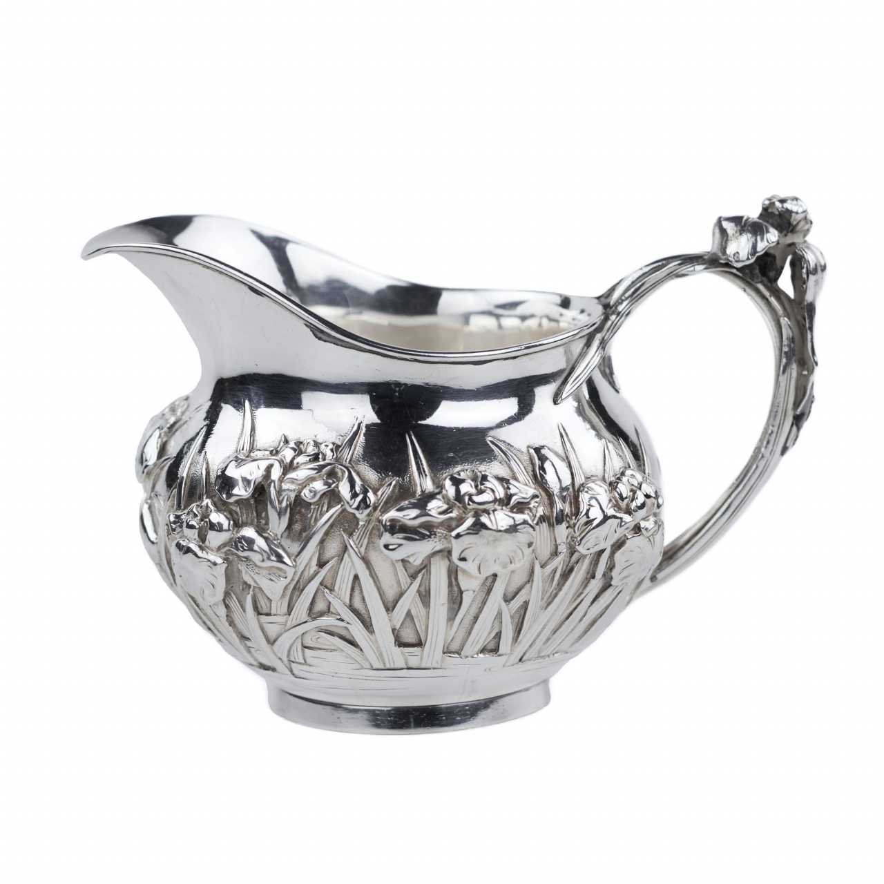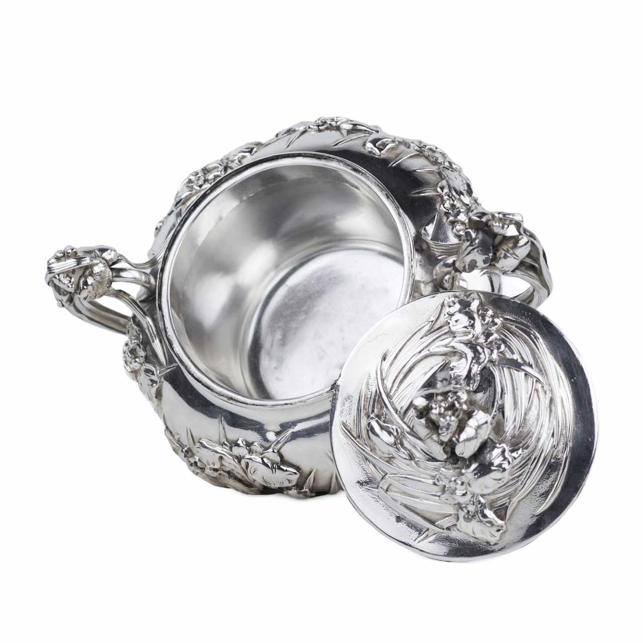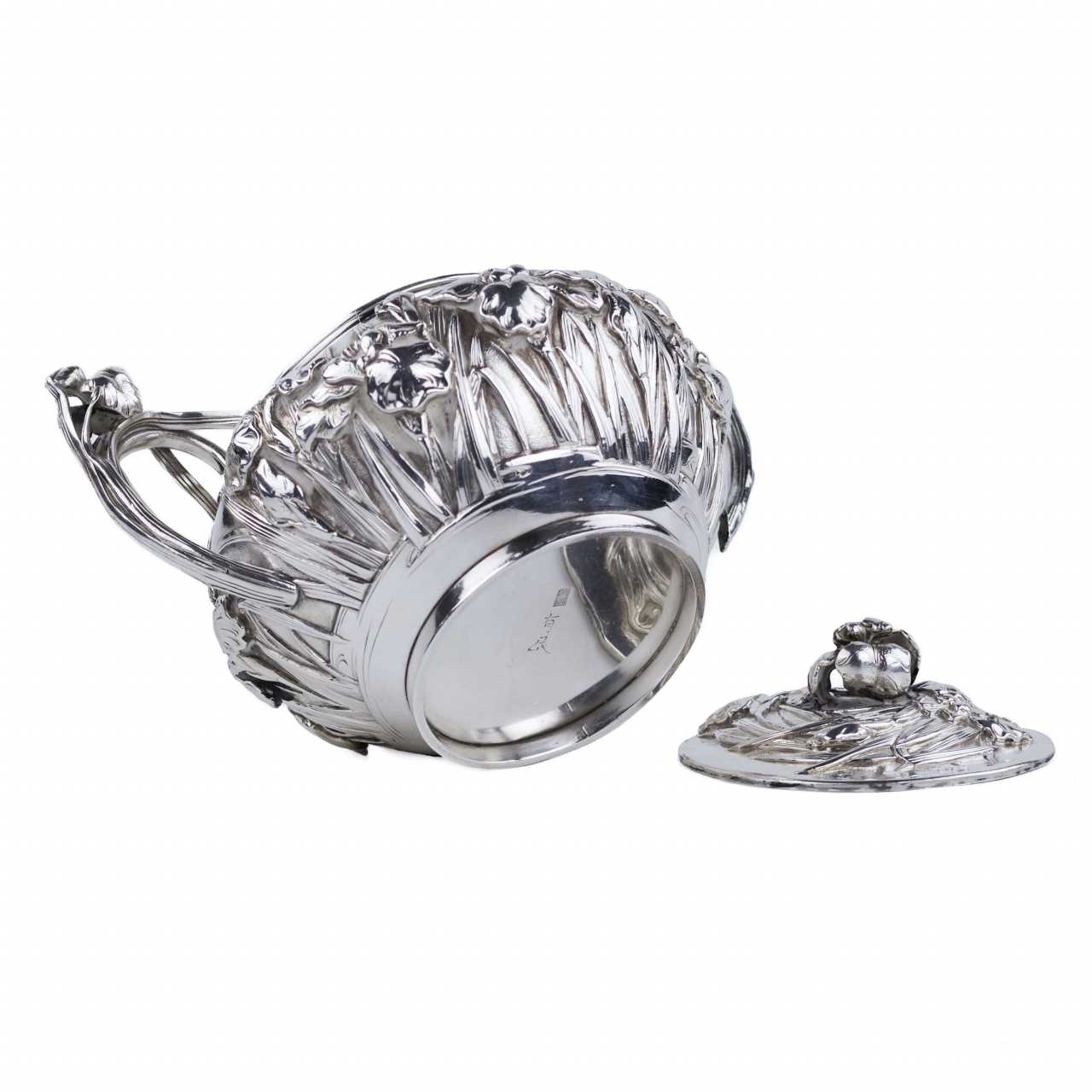 Rare service à thé japonais en argent de la période Meiji, travaillé dans un argent de haute qualité avec un niveau exceptionnel de finesse sculpturale. L’ensemble comprend trois pièces : une théière avec anse arquée mobile et bec courbé, un sucrier à deux anses avec couvercle, et un pot à crème. Tous les éléments sont décorés d’un riche motif en relief de fleurs d’iris — symbole majeur de l’art décoratif japonais.Le décor floral enserre les pièces dans leur totalité, créant un effet organique et rythmé. Les couvercles sont ornés de boutons floraux, prolongeant le motif principal dans une harmonie esthétique complète. Les pétales et tiges sont traités avec un modelé profond, accentuant les reflets de la lumière sur la surface de l’argent.Les anses et les becs présentent des détails floraux parfaitement intégrés à la forme générale, témoignant d’un savoir-faire orfèvre raffiné. L’intérieur des pièces est soigneusement poli.Chaque pièce porte deux poinçons bien visibles :– 純銀 (jungin — argent pur),– 有民 (Yūmin) — signature d’un maître orfèvre actif à Tokyo ou Yokohama à la fin du XIXe siècle, spécialisé dans les pièces d’exportation artisanales.Un chef-d’œuvre de l’orfèvrerie japonaise du XIXe siècle, alliant précision technique, symbolisme et équilibre esthétique.Poinçons :純銀 (argent pur), 有民 (Yūmin)Dimensions :Théière : 10 × 10 cm; Sucrier : 10 × 10 cm; Crémier : 10 × 10 cmPoids :Total : 1 296 gÉtat :Bon état avec légères traces d’usage. Argent intact, relief profond, poinçons nets. Bel exemple de l’orfèvrerie japonaise de la fin de l’époque Meiji.Provenance :Collection privée