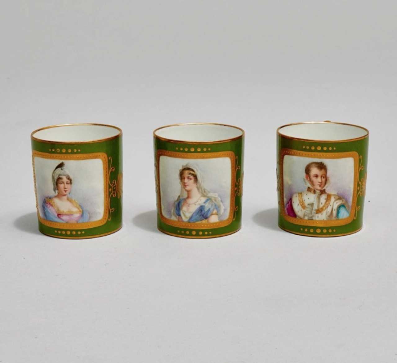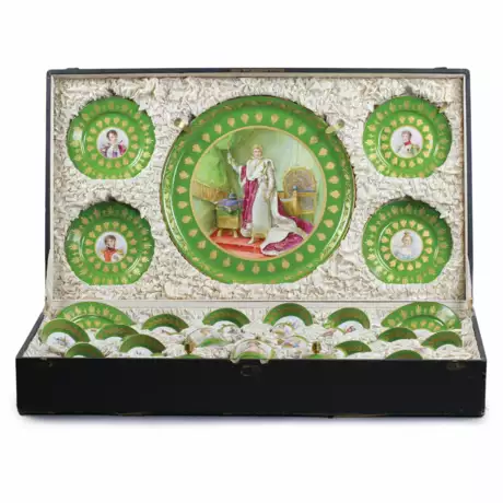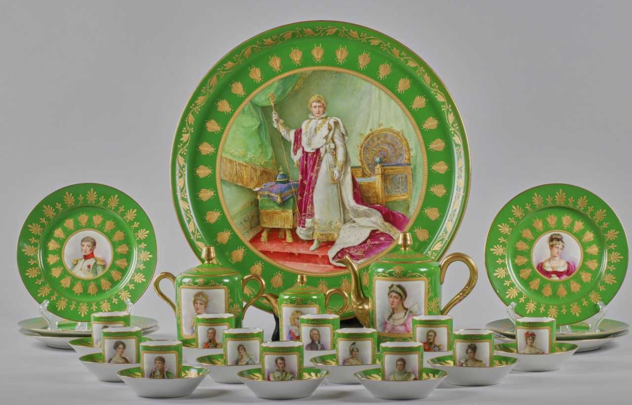 Ensemble de table unique Napoleon dans une boîte decorative, composee de 22 objets, avec des portraits de membres de la famille de Napoleon Bonaparte: 12 tasses à cafe et soucoupes, 6 assiettes, 1 cafetière, pot à lait, sucrier avec couvercle, sont reunis autour dun grand plat avec un portrait de ceremonie empereur. Sucrier, assiettes. Les tasses portent une miniature de portrait. Sur les soucoupes et cremier - accessoires militaires comme decor. Les articles ont des signatures et la marque de fabrication Sevre.