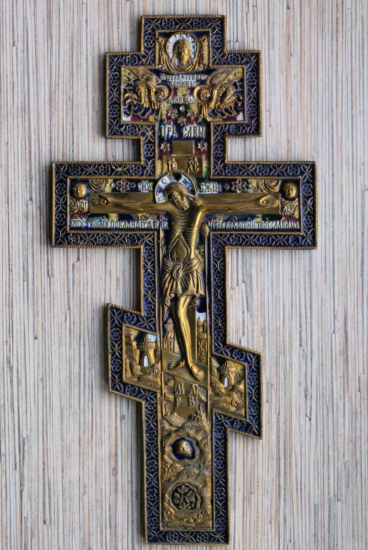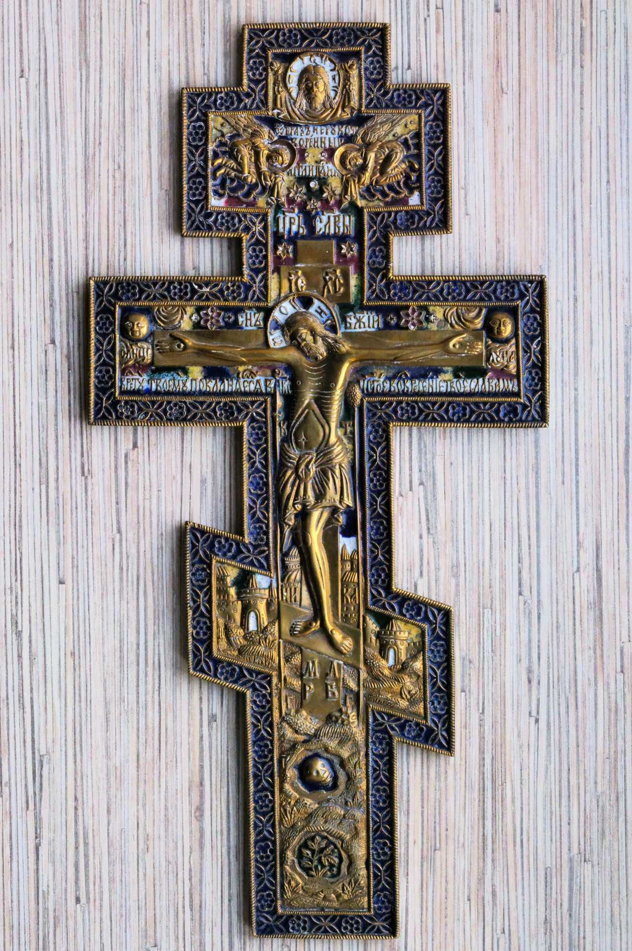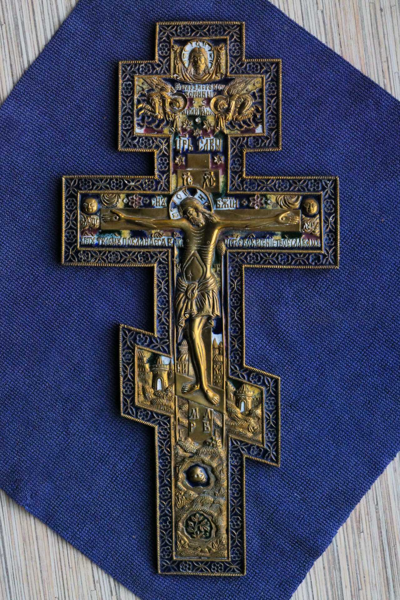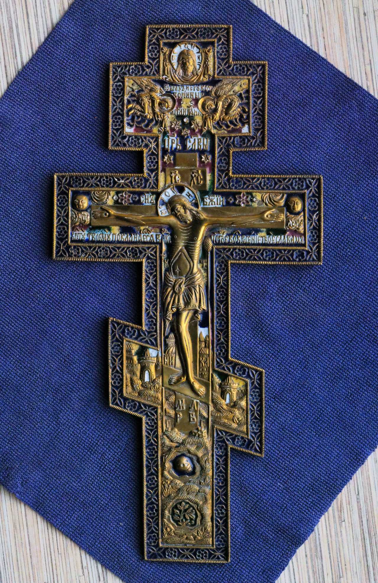 Уникальный старообрядческий киотный крест с полихромными перегородчатыми эмалями. Выг, XVIII век.
