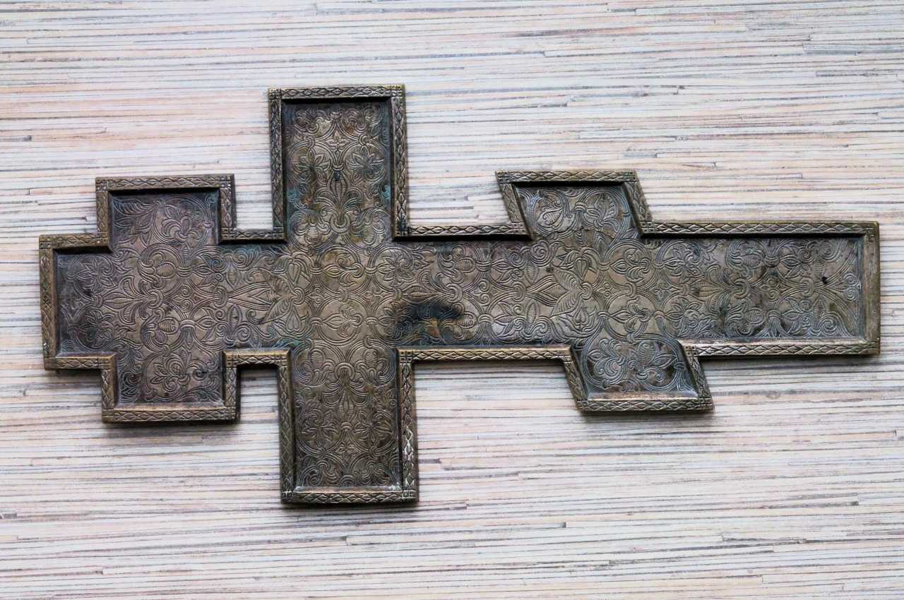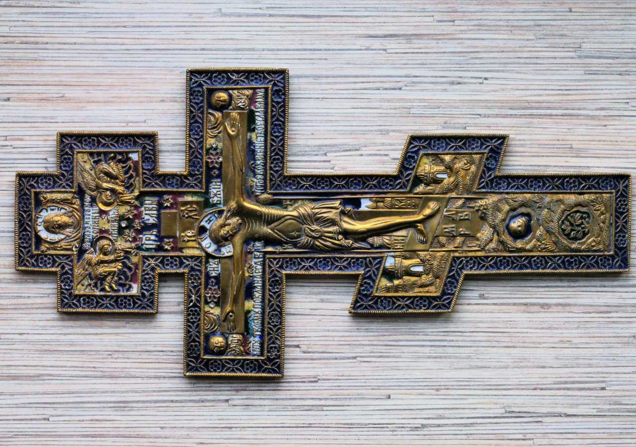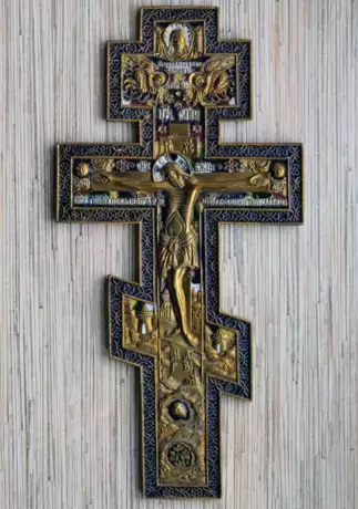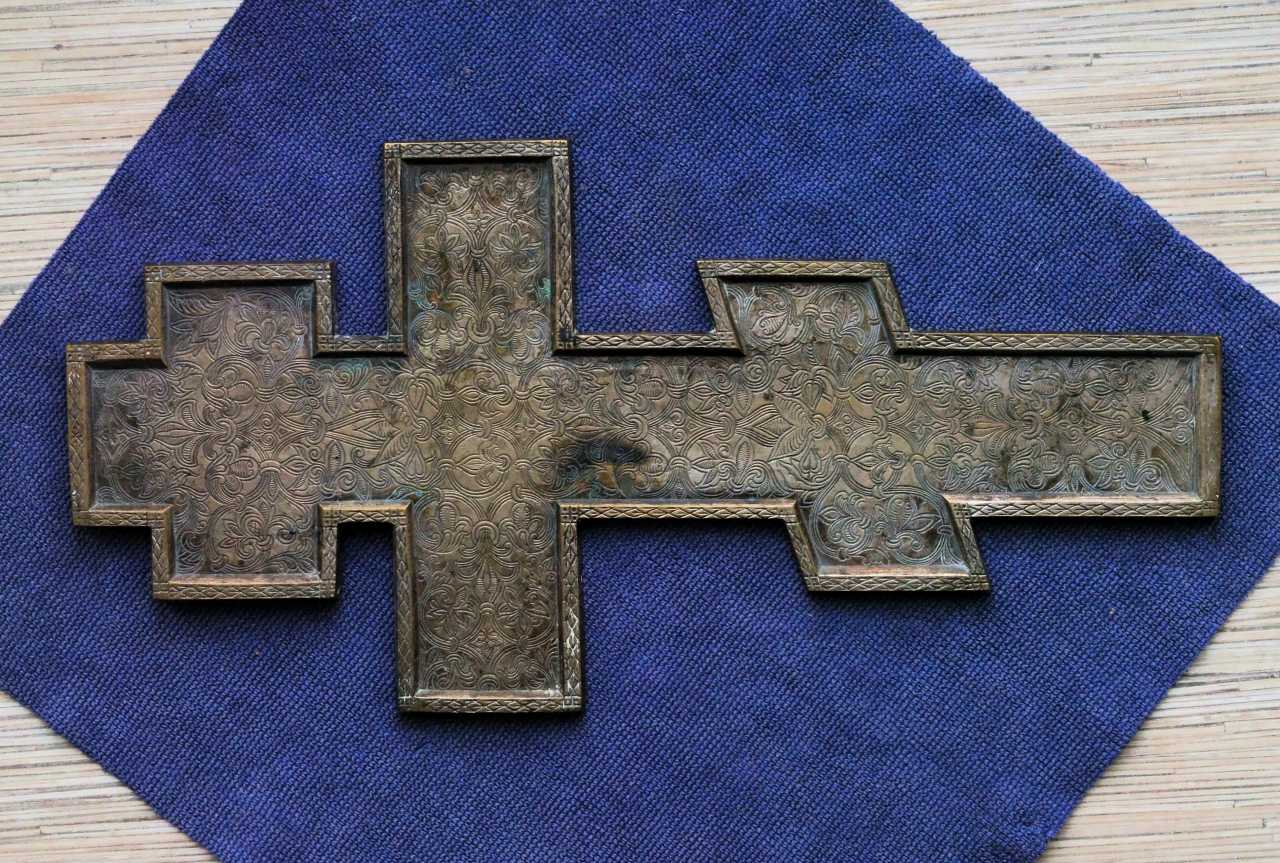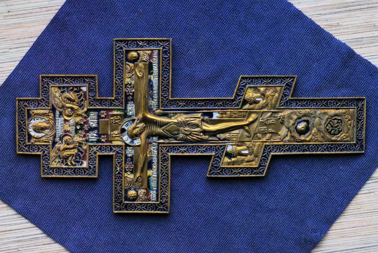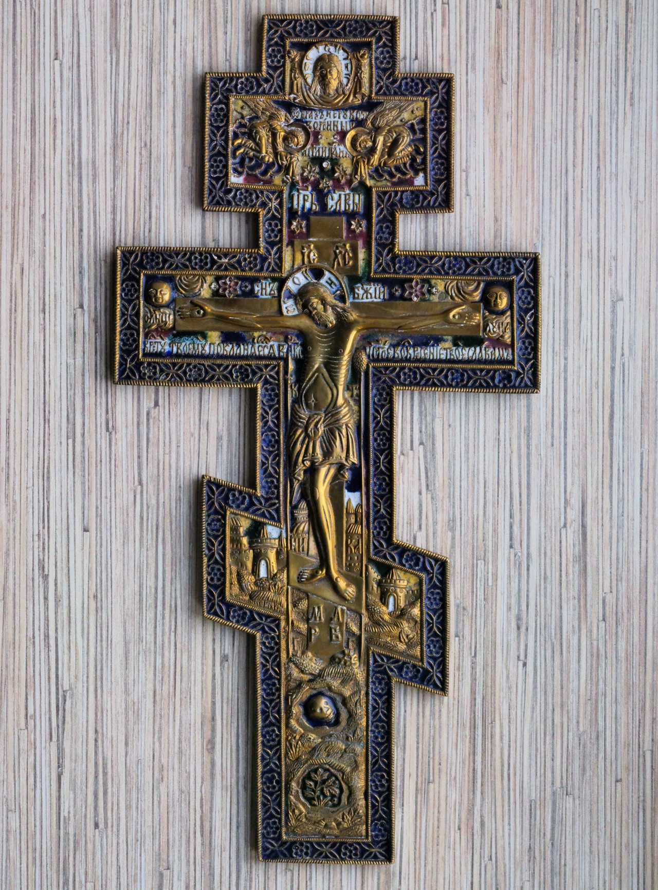 Уникальный старообрядческий киотный крест с полихромными перегородчатыми эмалями. Выг, XVIII век.