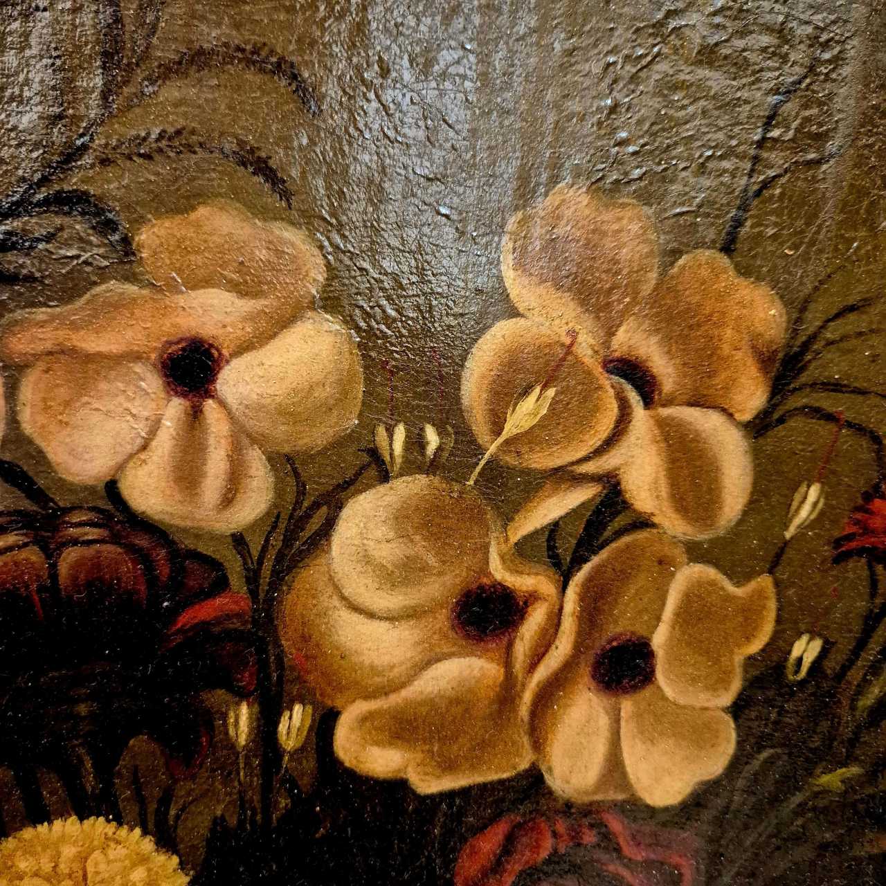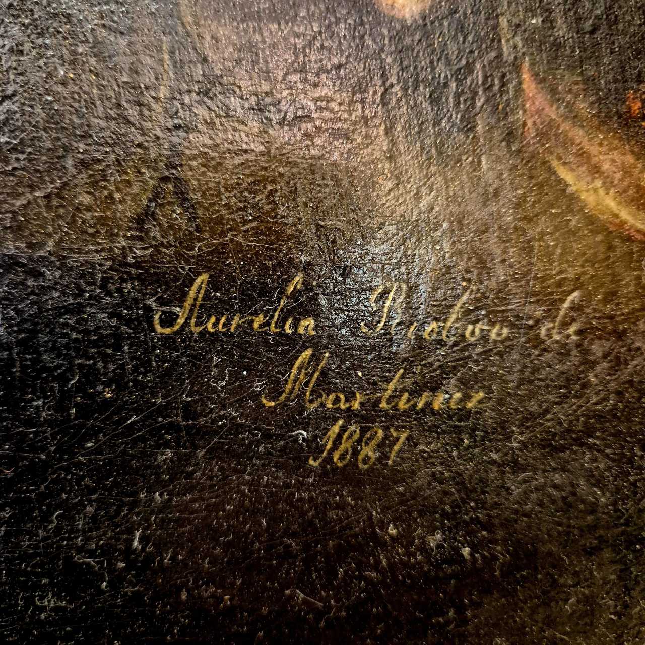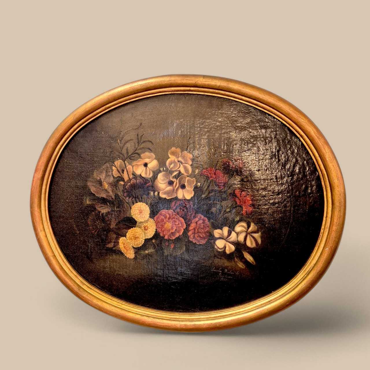 Still life painting with flowers, signed by the artist Aurelia Riolso De Mortimer, dated 1887. Beautiful glossy patina and characteristic craquelure. Original tondo oval frame. The painting has been re-coated by our professional restorer.