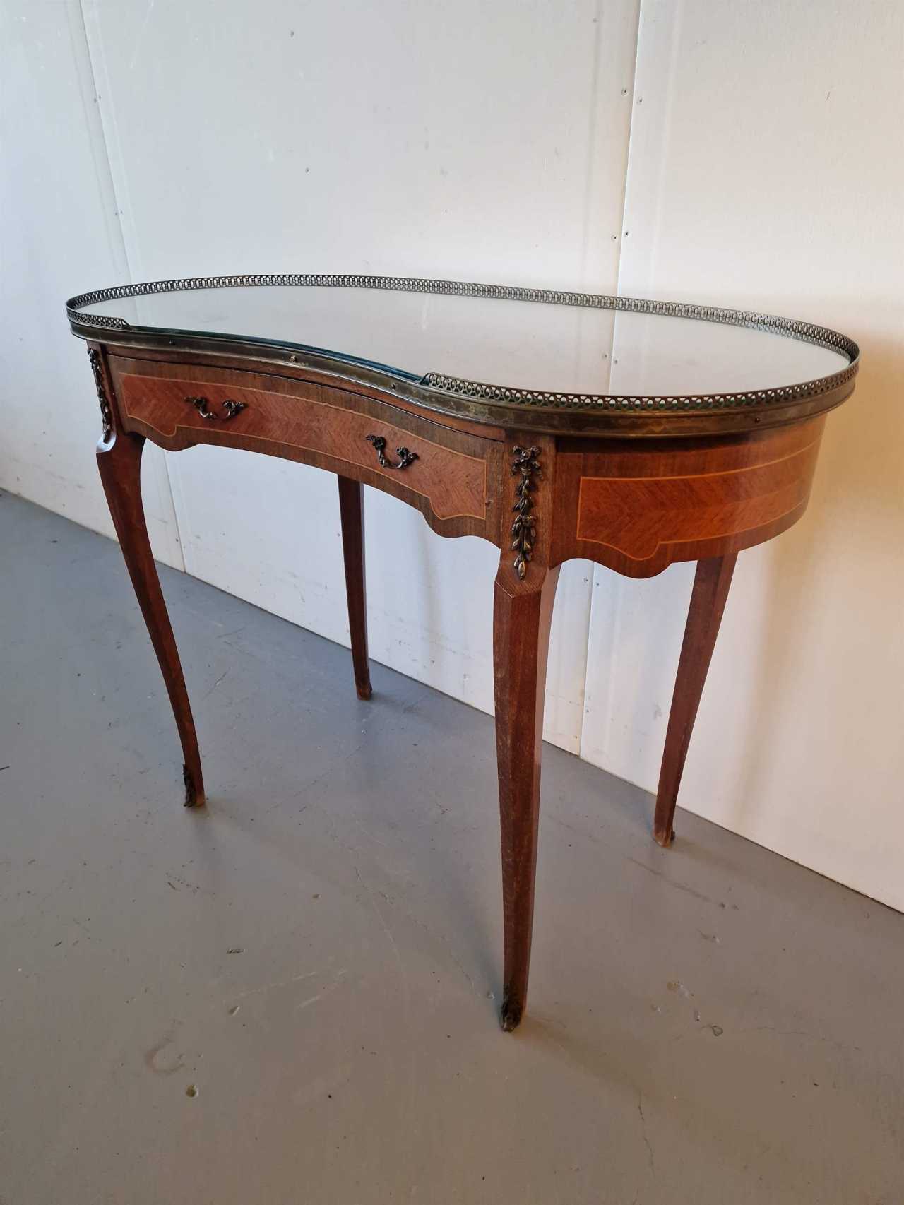 Table de dame.Placage d& 39;acajou, marqueterie.France.Années 1970.Dimensions : hauteur 78 cm ; longueur 99 cm ; profondeur 48 cm