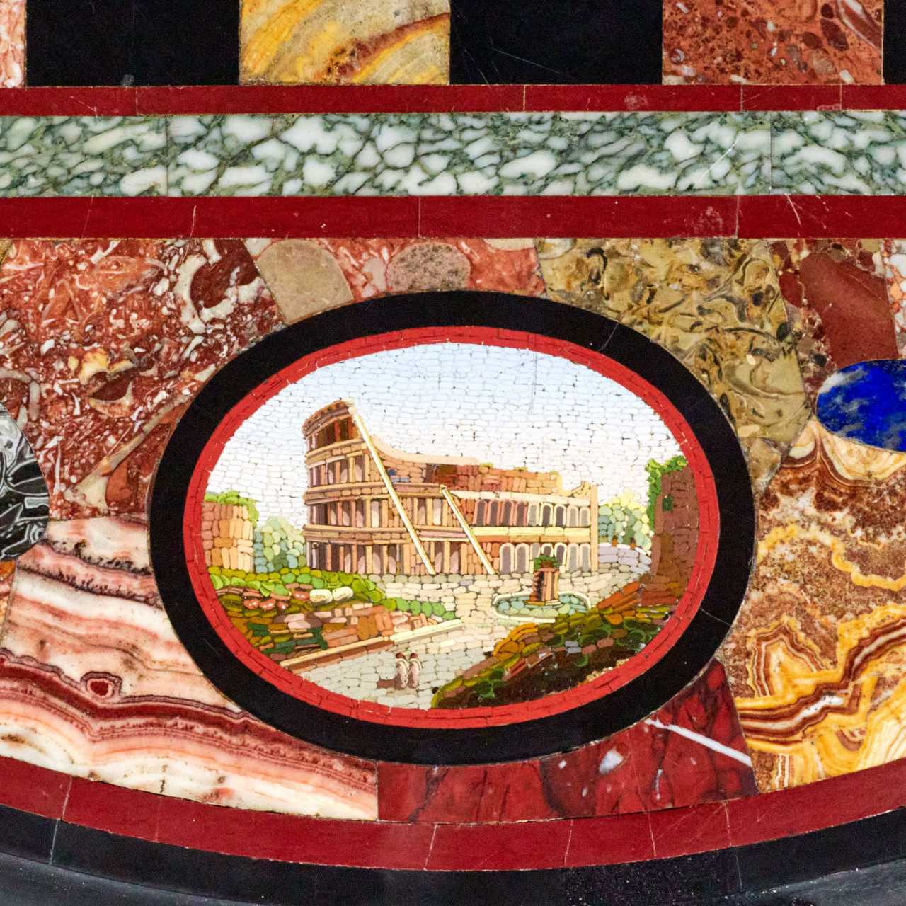 Remarquable table d’échecs, réalisée en Italie au XIXe siècle, représentant un exemple exceptionnel d’art décoratif avec une forte allégorie de l’éternité, incarnée à la fois dans le jeu d’échecs et dans la ville éternelle — Rome.Le plateau rond, exécuté en technique de pietra dura (incrustation de pierres semi-précieuses), forme un panneau unique réunissant un damier de cases alternées en jaspe, malachite, agate, lapis-lazuli et onyx, encadré de tondos en micromosaïque représentant des monuments de Rome : le Colisée, le Panthéon, la place Saint-Pierre et le Forum romain.Cette mosaïque colorée est enrichie par des miniatures en micromosaïque aux perspectives architecturales raffinées — véritables chefs-d’œuvre de l’art lapidaire.La table repose sur quatre pieds richement sculptés dans un style néo-Renaissance, ornés de mascarons en bustes antiques drapés, volutes d’acanthe et entretoise croisée.Poinçons : absents ou non spécifiésDimensions : Hauteur – 66 cm ; diamètre – 62 cmÉtat : Excellent état, légères traces d’usageOrigine : Italie, XIXe siècle