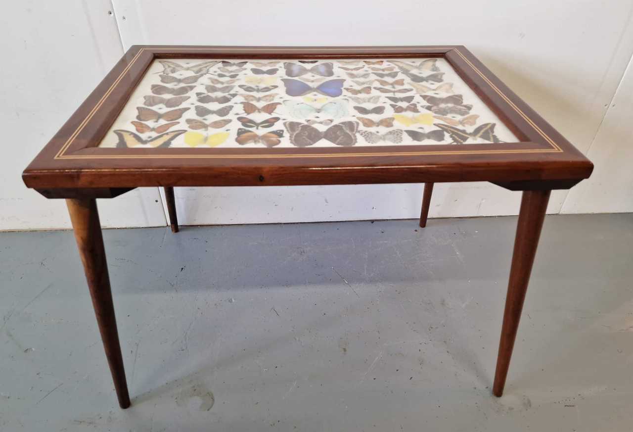 Table vintage avec papillons. Brésil. Années 1960. Bois exotique, marqueterie, papillons de différentes essences. Dimensions : hauteur 52 cm ; longueur 71 cm ; largeur 51 cm.