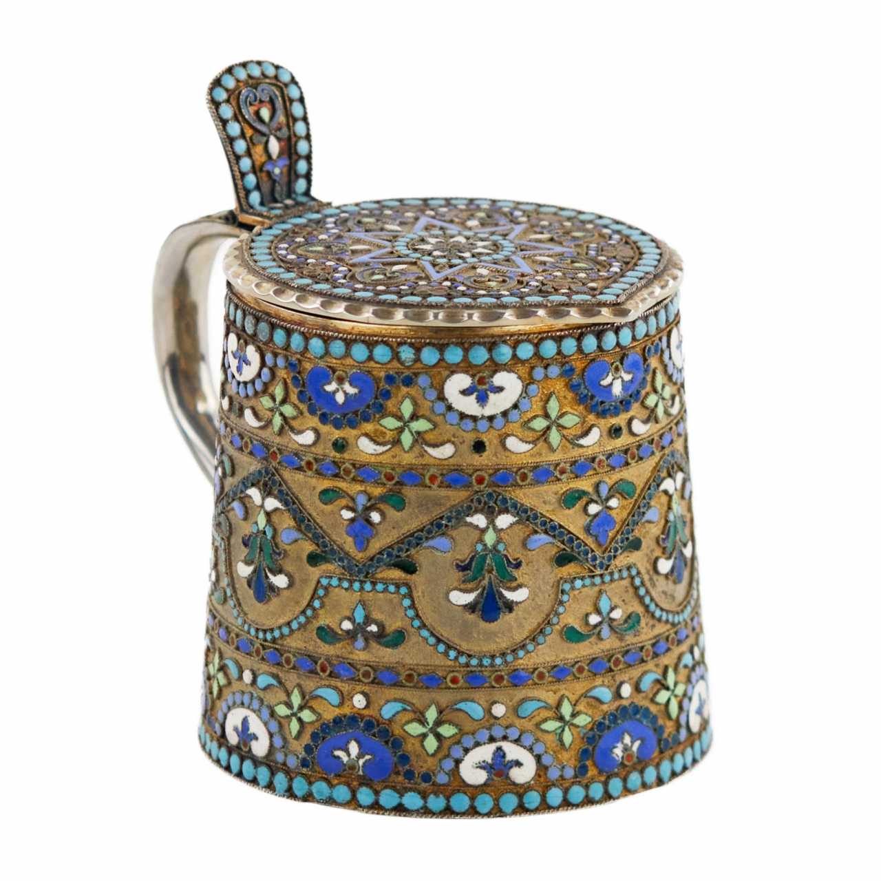 Tasse russe en argent avec couvercle à charnière, émail cloisonné, de style néo-russe. Cachet ovale, tête de jeune fille au kokochnik à droite et monogramme IL. Marque du fabricant de la VM. Dimensions : 12 x 11,5 x 9 cm Poids : 369 g. Argent, émail, dorure.