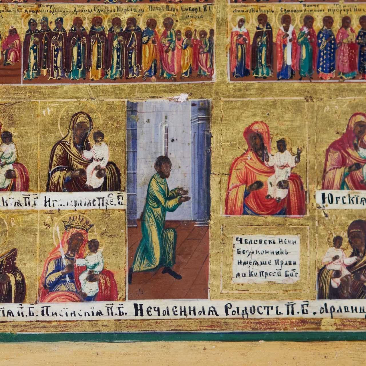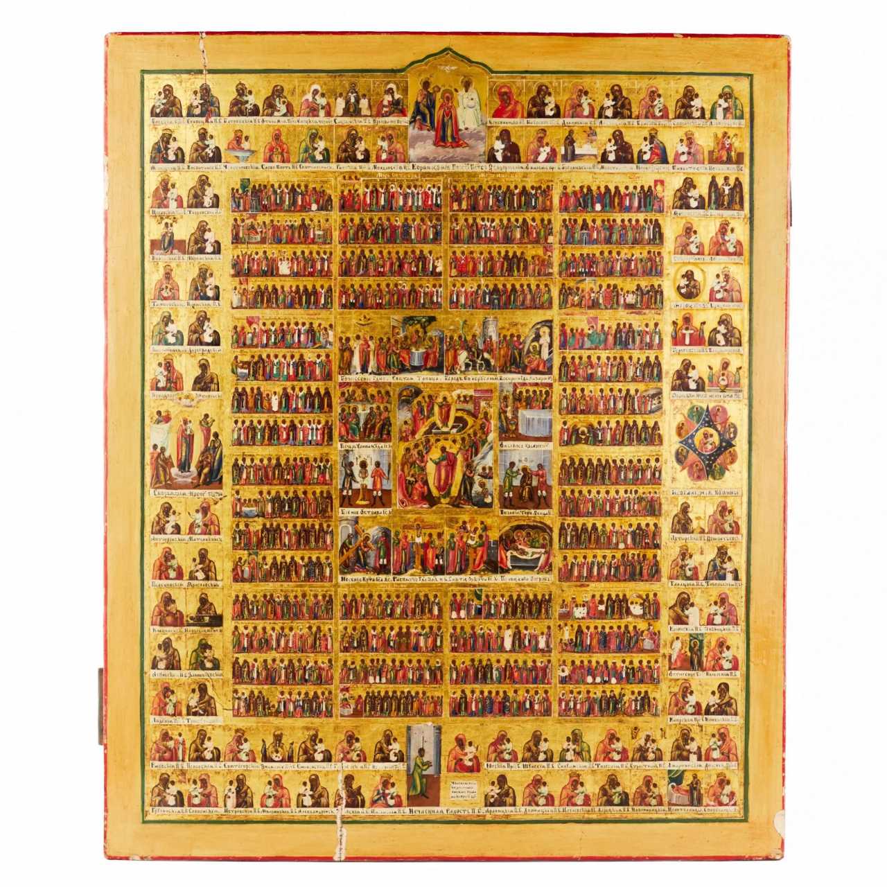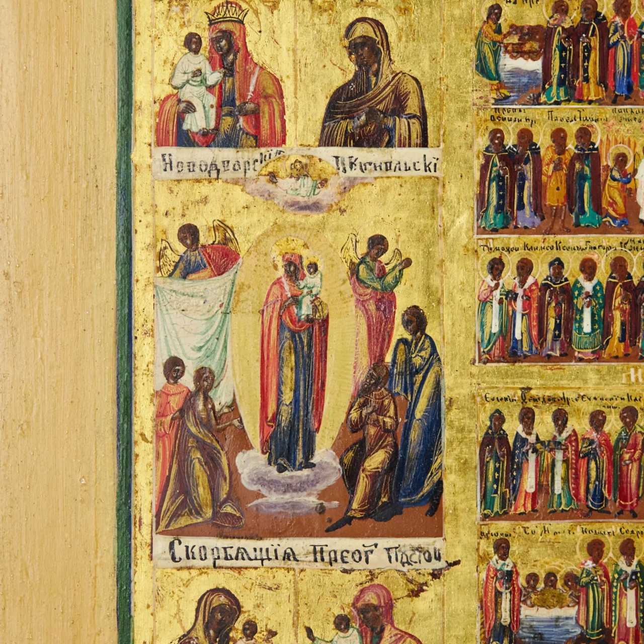 Une magnifique icône des Fêtes avec un menaion annuel et un cycle à deux rangées d`icônes de Theotokos. Russie.19ème siècle. Wood gesso gilding tempera 19th century