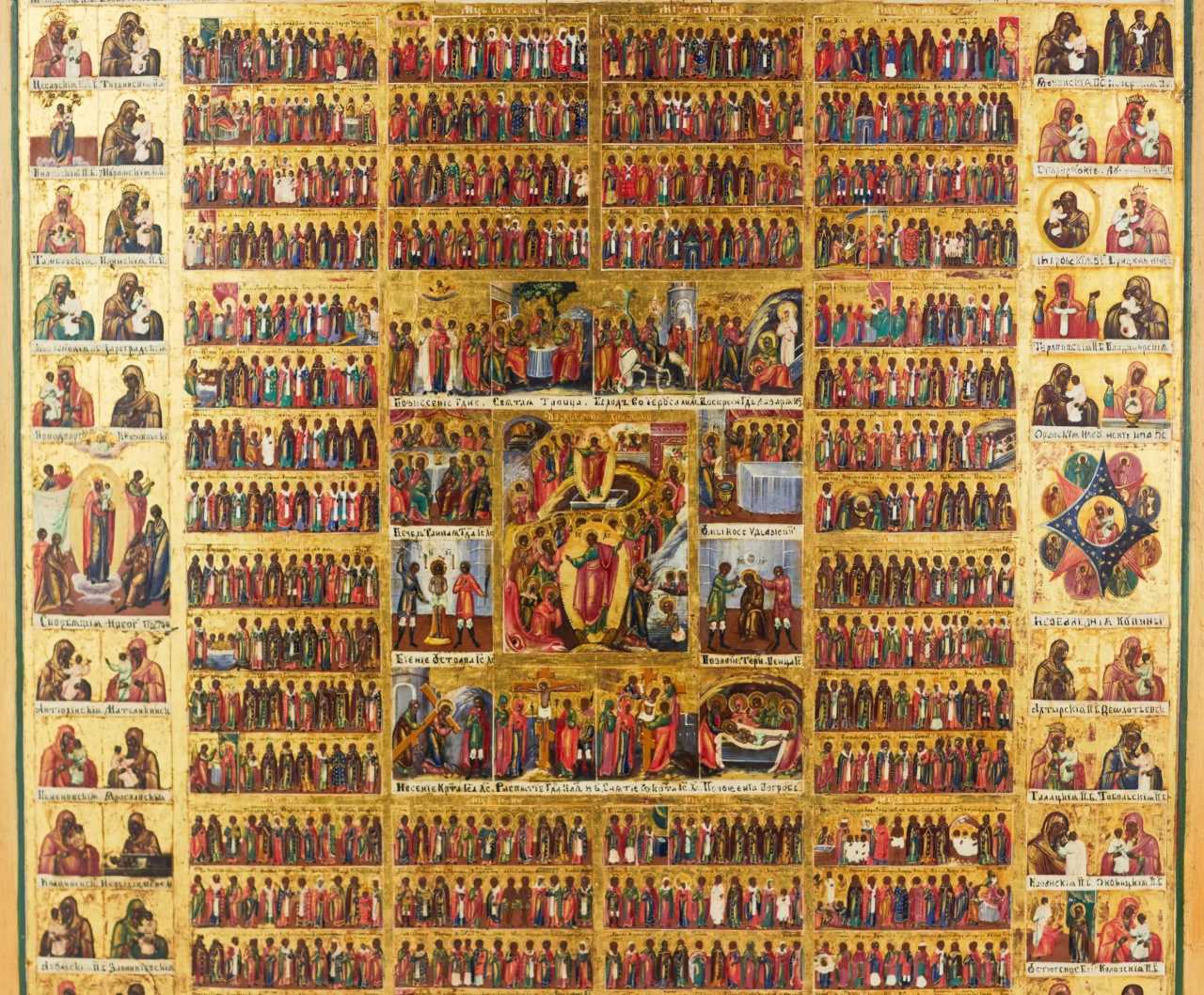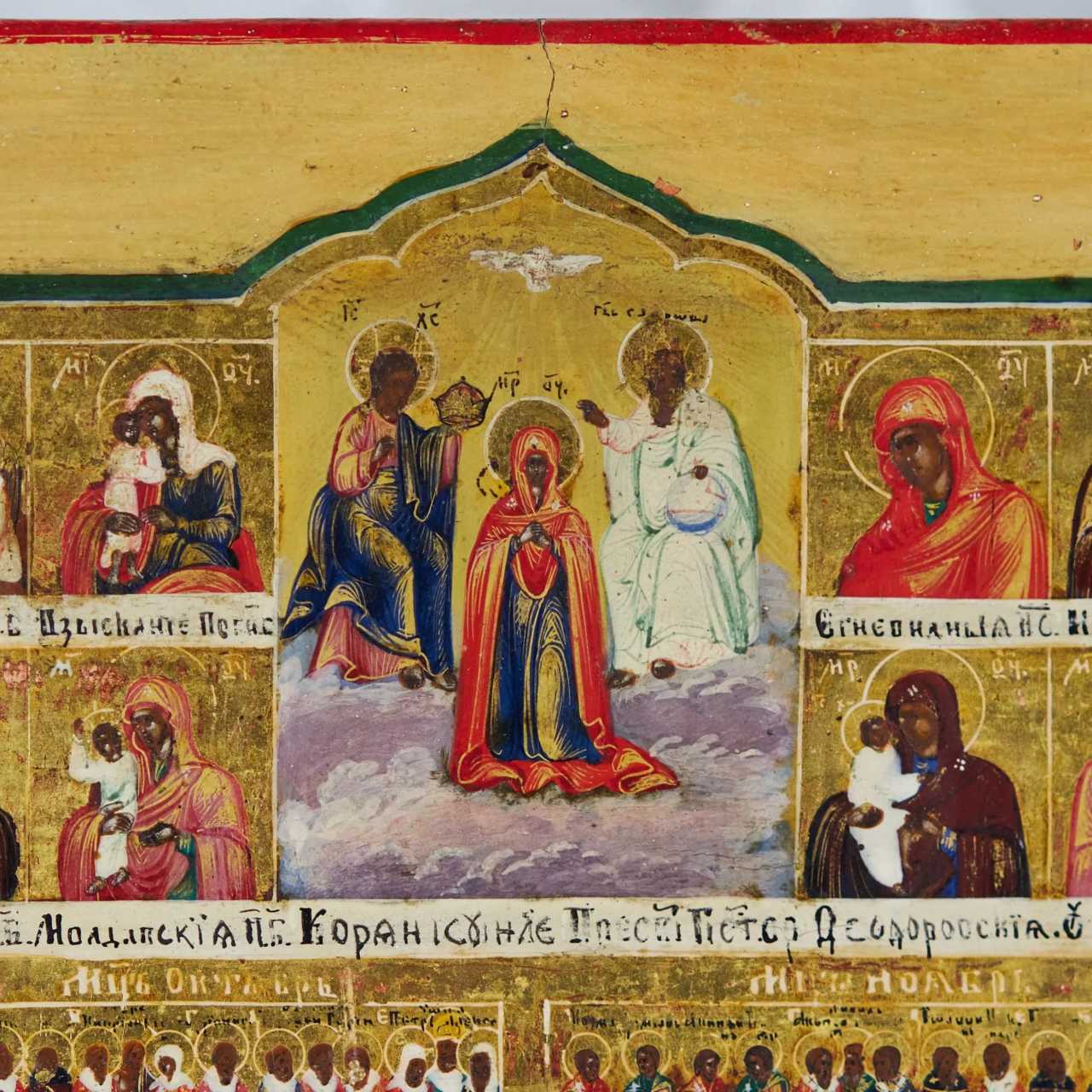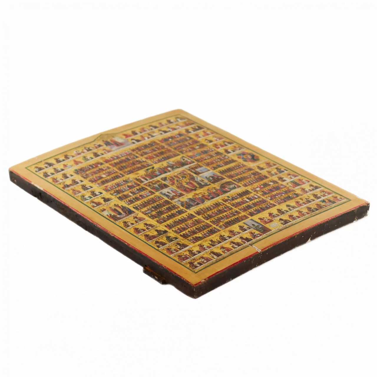 Une magnifique icône des Fêtes avec un menaion annuel et un cycle à deux rangées d`icônes de Theotokos. Russie.19ème siècle. Wood gesso gilding tempera 19th century