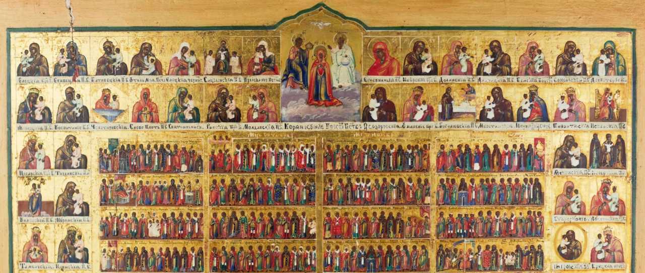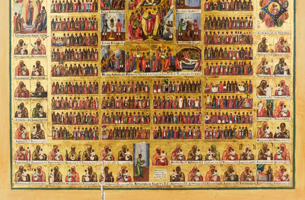 De magnifiques fêtes avec une rangée passionnée, une menaion annuelle et un cycle à deux rangées d`icônes de la Mère de Dieu - une sorte d`encyclopédie des images de la Mère de Dieu. Un monument majestueux du christianisme et de la peinture d`icônes russe tardive, où se révèle dans une seule image l`univers annuel et Mère de Dieu de l`Orthodoxie, plein de sacrifices. Avec l`épicentre de la souffrance et de la résurrection, le témoignage de tous les saints à venir et avec l`espérance dans les images miraculeuses de l`intercesseur. La série Theotokos est interrompue par les marques de la joie inattendue, de la joie de tous ceux qui souffrent, du signe et du couronnement de Marie - jalons de la communion et de la croissance des vérités spirituelles. La série Passion est composée de : l`Ascension de Marie, la Trinité de l`Ancien Testament, l`Entrée à Jérusalem, la Résurrection de Lazare, le Lavement des pieds, la Cène, la Flagellation du Christ, l`Imposition de la Couronne d`épines, le portement de croix, la crucifixion, la descente de croix et la mise au tombeau. La rare exhaustivité des listes d`icônes de la Mère de Dieu, qui peuvent servir d`encyclopédie des images de la Mère de Dieu, est particulièrement attrayante. La peinture décorative lumineuse sur fond doré semble passionnante, solennelle et vivifiante. Planche de cyprès, gesso, tempera, dorure. Russie. Deuxième moitié du 19ème siècle. Dimensions : 53x44cm.