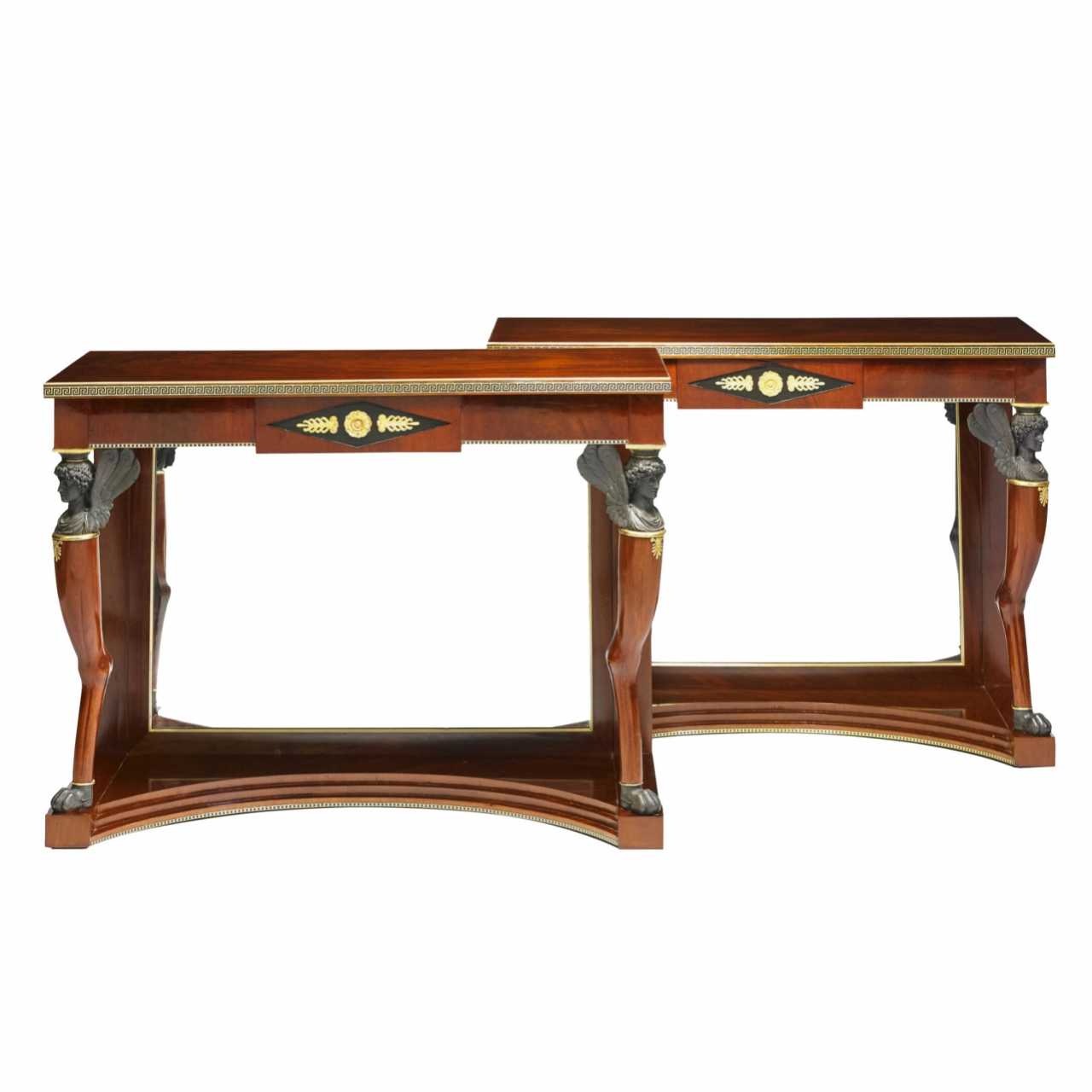 Paire de consoles de style néoclassique russe en acajou, ornées dun décor de bronze doré, daprès le modèle de Heinrich Daniel Gumbs (1765-1831). Les pieds avant sont décorés de garnitures en bronze en forme de pattes de lion et de figures de génies ailés. Saint-Pétersbourg. 19e-20e siècle. Hauteur : 83 cm, largeur : 110 cm, profondeur : 48 cm (2). Restauration effectuée
