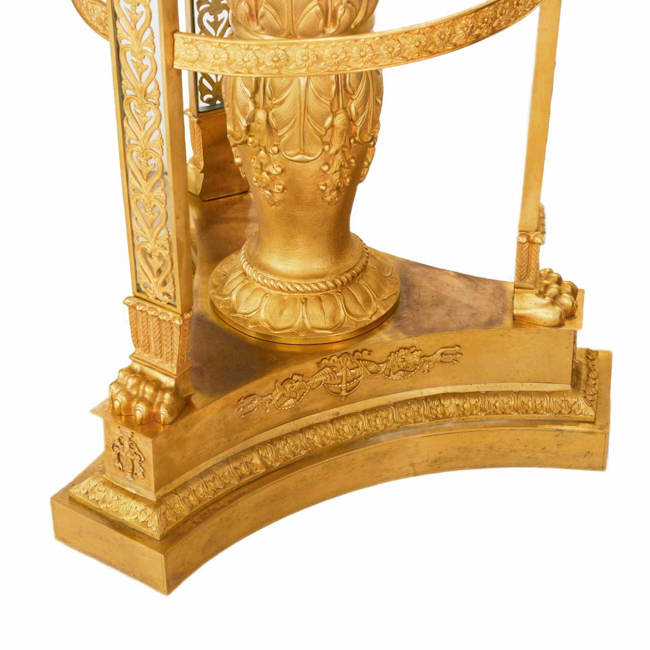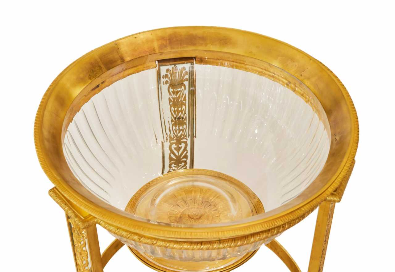 Une paire de grandioses pots de fleurs jardinière au sol conçus pour décorer les grands espaces. Ils peuvent être associés à des bouquets de fleurs fraîches, séchées ou artificielles. Lhémisphère transparent est en verre cannelé fin, vraisemblablement Baccarat. Le pied, les colonnes décoratives, les arceaux, le socle en bronze doré à trois rayons sont décorés de palmettes, de grotesques et de cordelette torsadée. Les supports décoratifs reposent sur des pattes de lion. Les surfaces latérales des socles sont décorées de superpositions décoratives. France Tour des XIXe-XXe siècles. Bronze, verre, fonte, ciselure, dorure. Hauteur - 105 cm, diamètre - 57 cm.