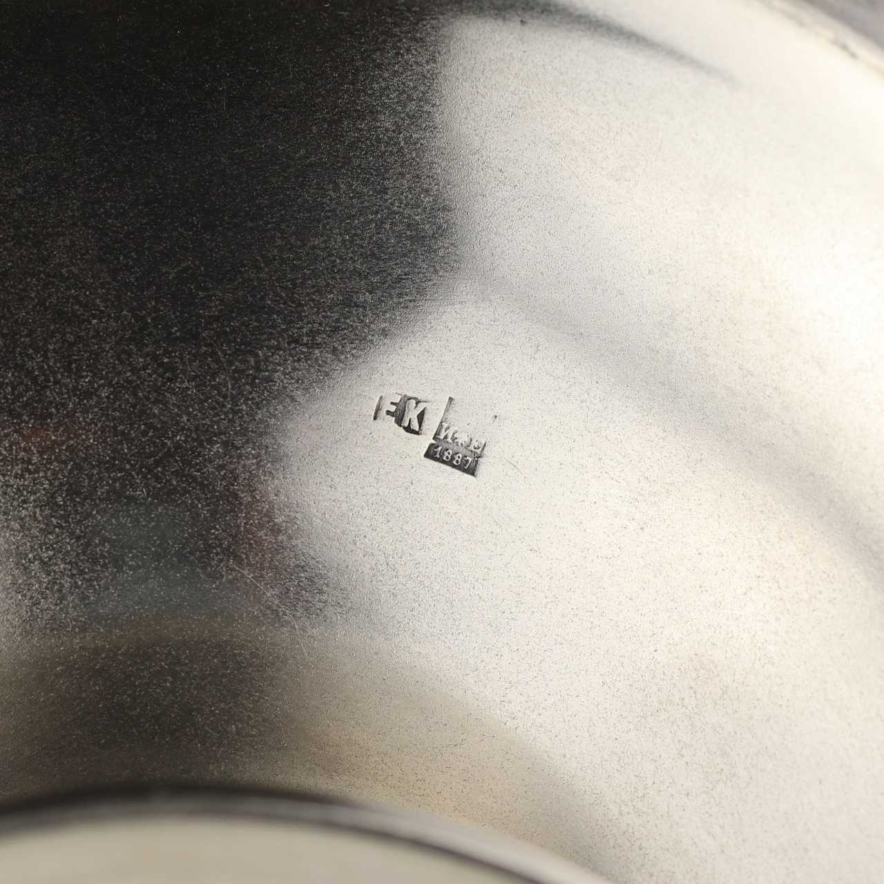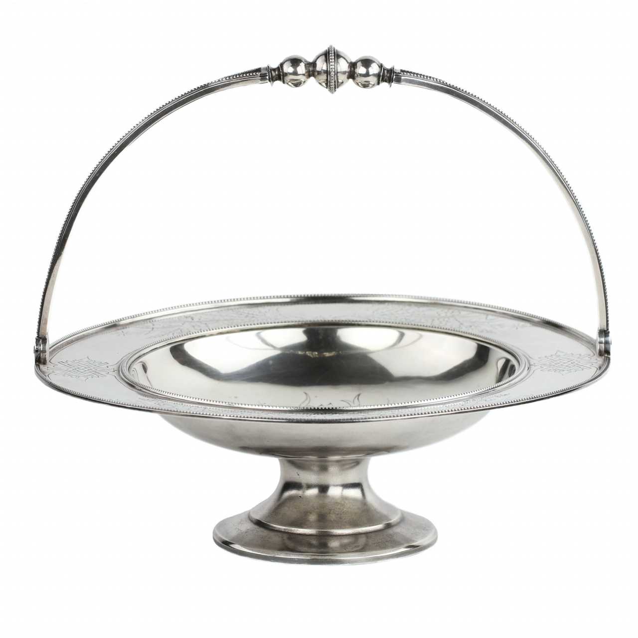 Un exquis bol à bonbons en argent créé en 1887 par l`orfèvre exceptionnel qui travaillait pour la maison Fabergé, Erik August Kollin, un éminent représentant de l`école de joaillerie russe du XIXe siècle. Le vase se distingue par ses proportions harmonieuses, ses contours élégants et l`exécution magistrale des éléments décoratifs. La décoration principale est un ornement exquis réalisé selon la technique du dessin au burin. Le champ central est décoré d`une composition symétrique de guirlandes de fleurs stylisées, se prolongeant en douceur sur les côtés, encadrées de perles imitant des perles, avec des champs décorés de motifs panslaves et de bouquets de fleurs. L`anse du vase, décorée d`éléments sphériques, confère au produit sophistication et harmonie des formes. Poinçons: Nom du maître: EK - Eric Collin. Poinçon de contrôle de Saint-Pétersbourg avec la date de 1887, titre en argent : 84 et les initiales IE – maître de contrôle inconnu, actif dans la période 1870-1891, armoiries de la ville de Saint-Pétersbourg. Dimensions : Hauteur : 23 cm, Diamètre : 25,5 cm. Poids : 671 g. Contexte historique : Erik August Collin (1836–1901) était un joaillier finlandais connu pour sa collaboration avec la société Carl Fabergé. De 1870 à 1886, Collin travaille comme maître artisan chez Fabergé, où il crée des bijoux de haute qualité. L`une de ses œuvres célèbres est un étui à cigarettes associé à l`empereur Alexandre III, fabriqué par la firme Fabergé. Les œuvres d`Eric Collin font partie des collections de musées tels que les musées du Kremlin de Moscou et l`Art Institute de Chicago.