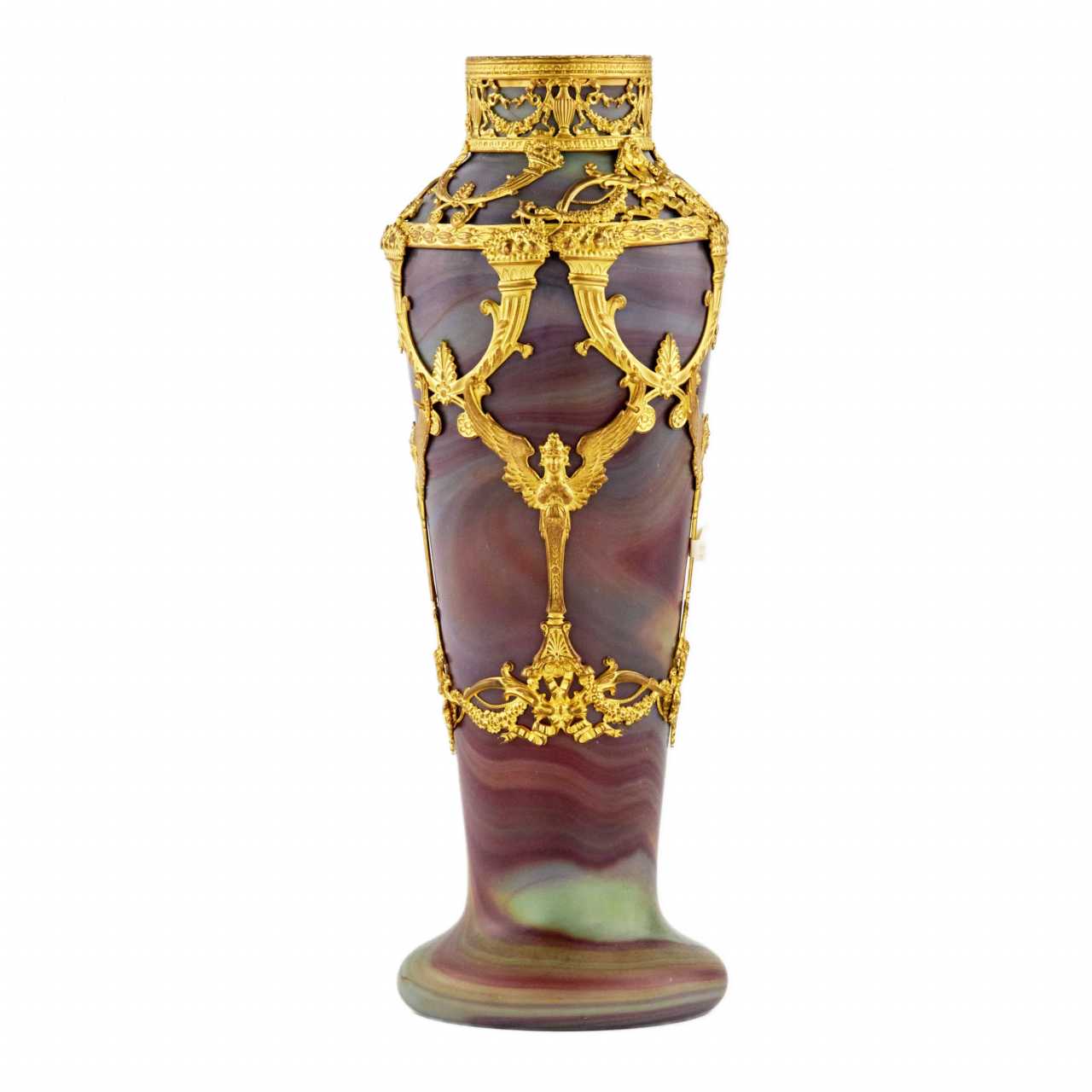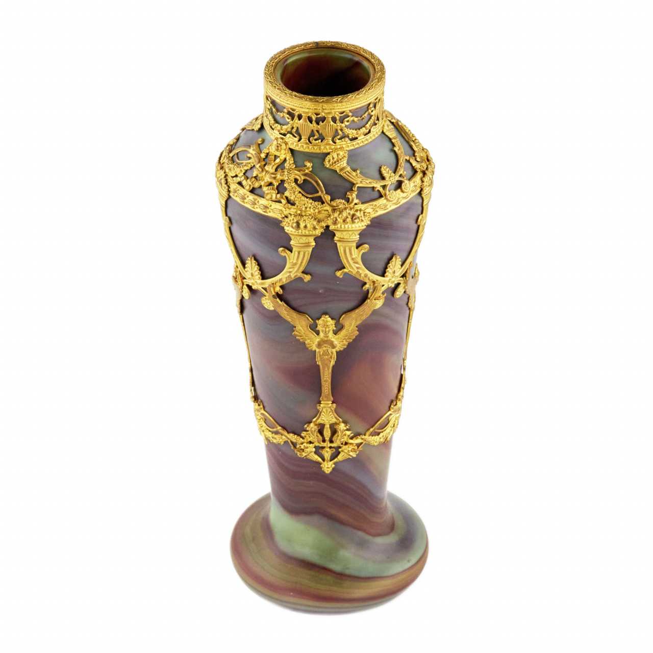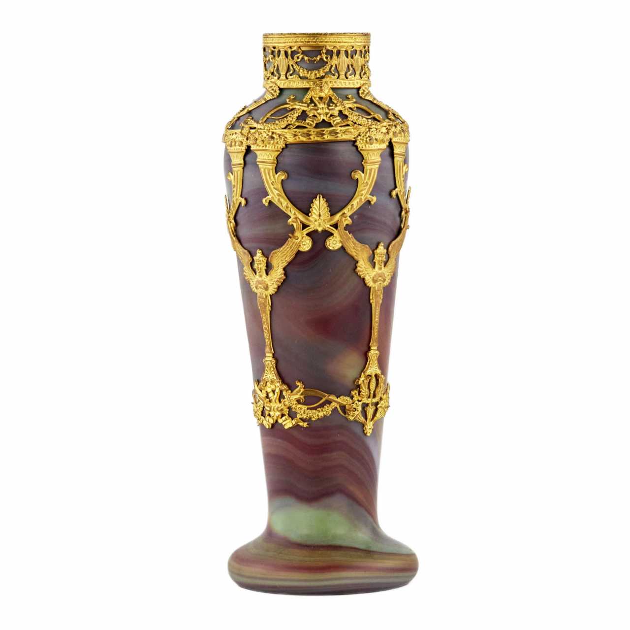 Un vase unique en verre d`agate et decore de ferrures dorees. Les superpositions decoratives epousent le corps moderne du vase avec un motif de vagues. Leur arsenal de cuivres regorge de grotesques neoclassiques. Marque : Sèvres.
